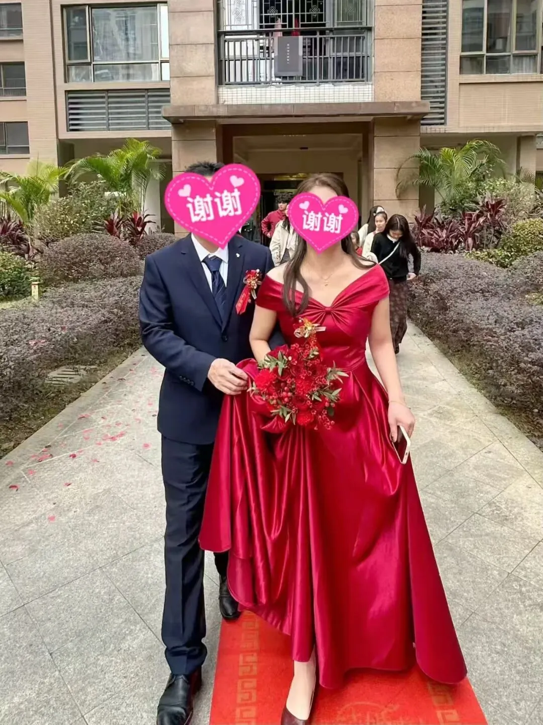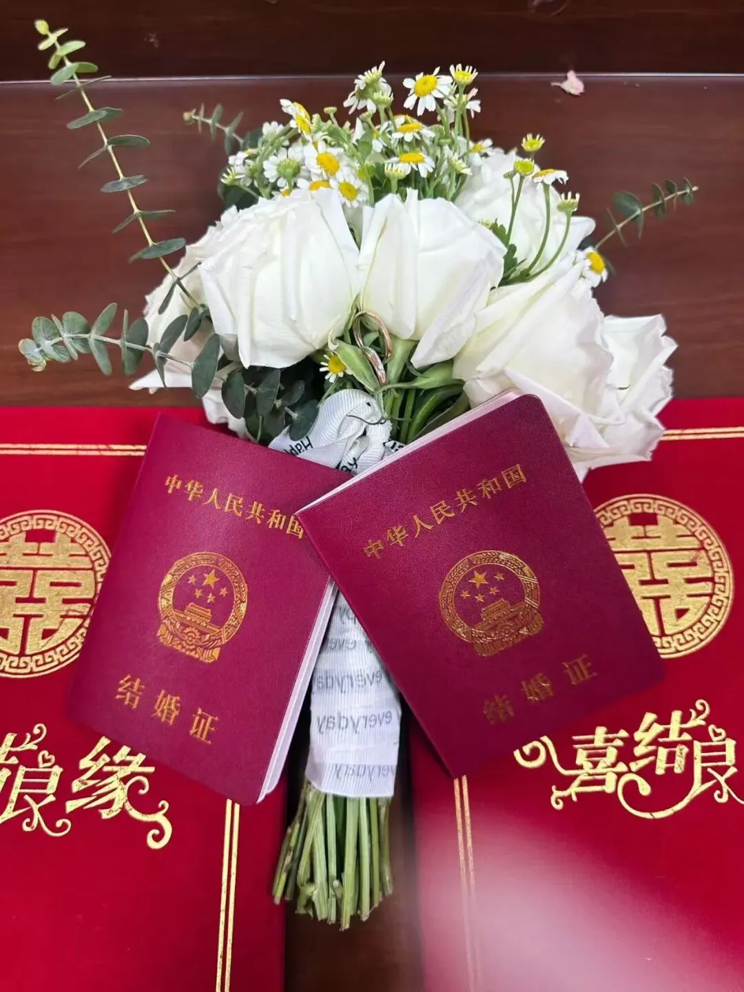 从精心打扮的订婚礼服,到民政局里的简约白衫,每一张照片都洋溢着藏不住的幸福。红色的背景板见证承诺,洁白的捧花象征纯粹,这就是爱情最美的样子。