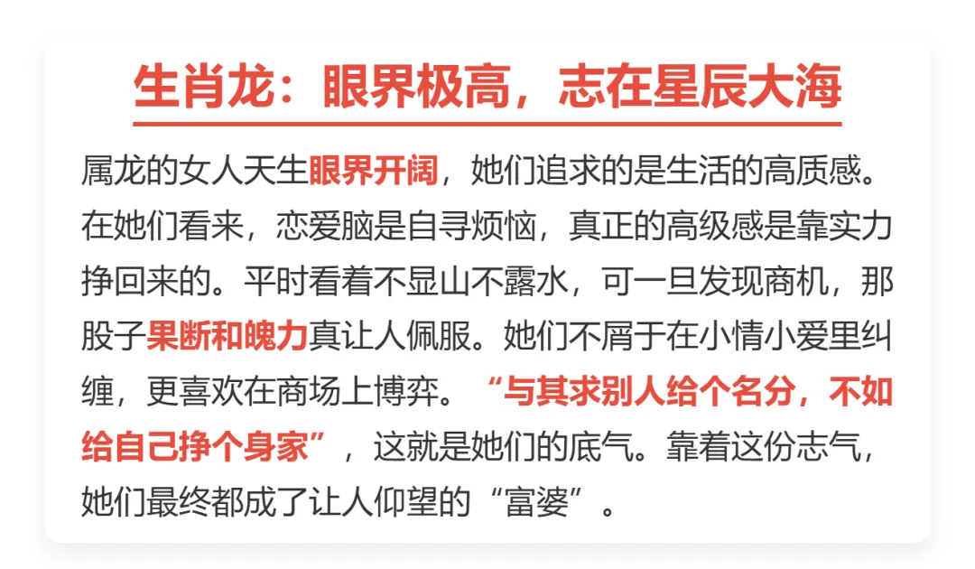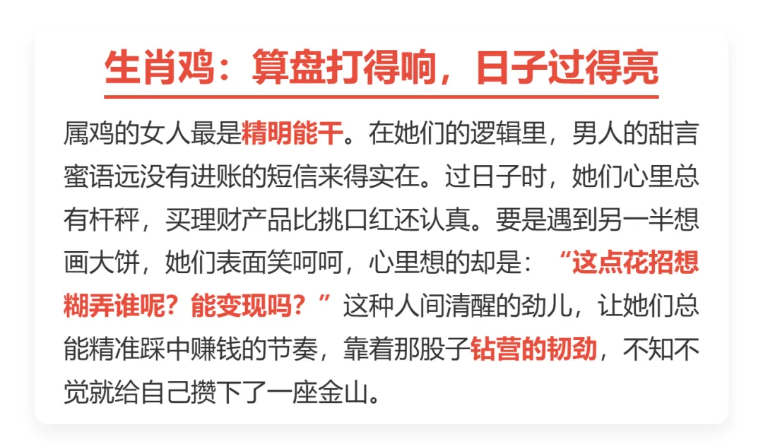 《尚书》里有.句话叫:“民惟.邦本,本固邦.宁。”其实放.在咱女.人身.上,这手里.的钱,就是.咱安身立.命的“本”。这年.头,指望谁都.不如.指望卡.里的.余额。咱们.今儿.就聊.聊,那几个.天生.不信.爱情神.话,一门.心思只想.往兜里揣.钱的.生肖女,瞧瞧人.家是.怎么活成.豪门的。