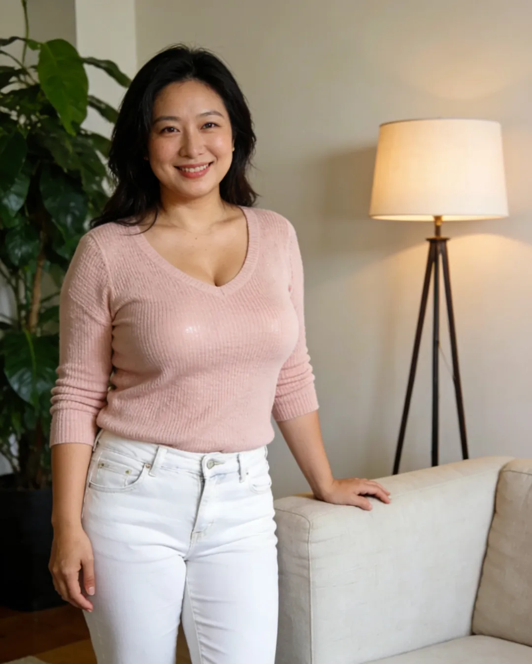 身高一米六五左右,体重看着一百二左右,腰细,腿长,穿白色牛仔裤绷得紧紧的。胸不小,毛衣那里有点撑。再点开一张自拍,皮肤白,眼睛大,嘴唇有点厚,笑起来挺甜。