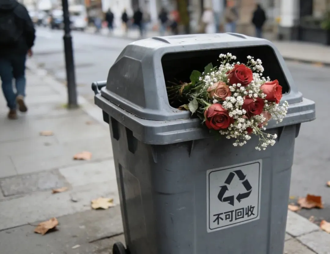 然后下车,把那束粉玫瑰从后座拿出来,扔进了路边的垃圾桶。