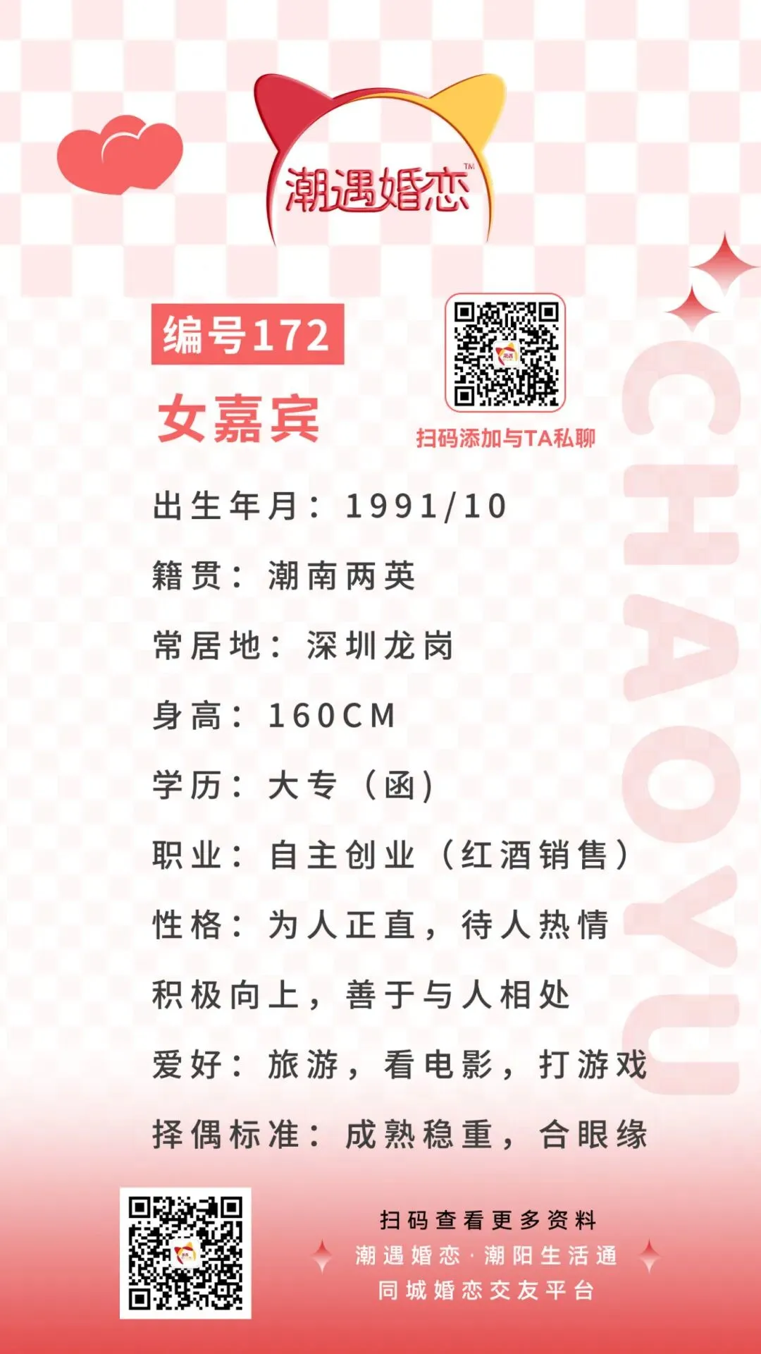 【潮遇婚恋】嘉宾:编号172号女嘉宾 · 常居深圳龙岗,自主创业~