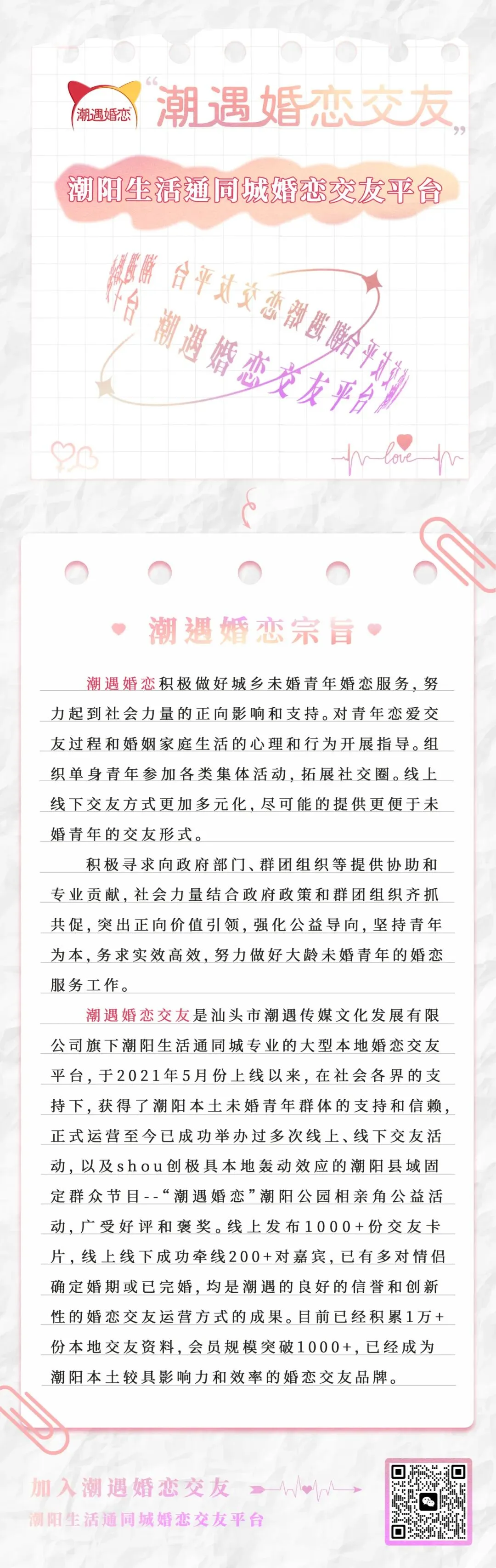 诚意想与嘉宾认识的可扫码联系潮遇红娘牵线,将本期嘉宾的编号/交友卡片发送给潮遇红娘,开启心动模式,与嘉宾微信聊天深入了解哟!