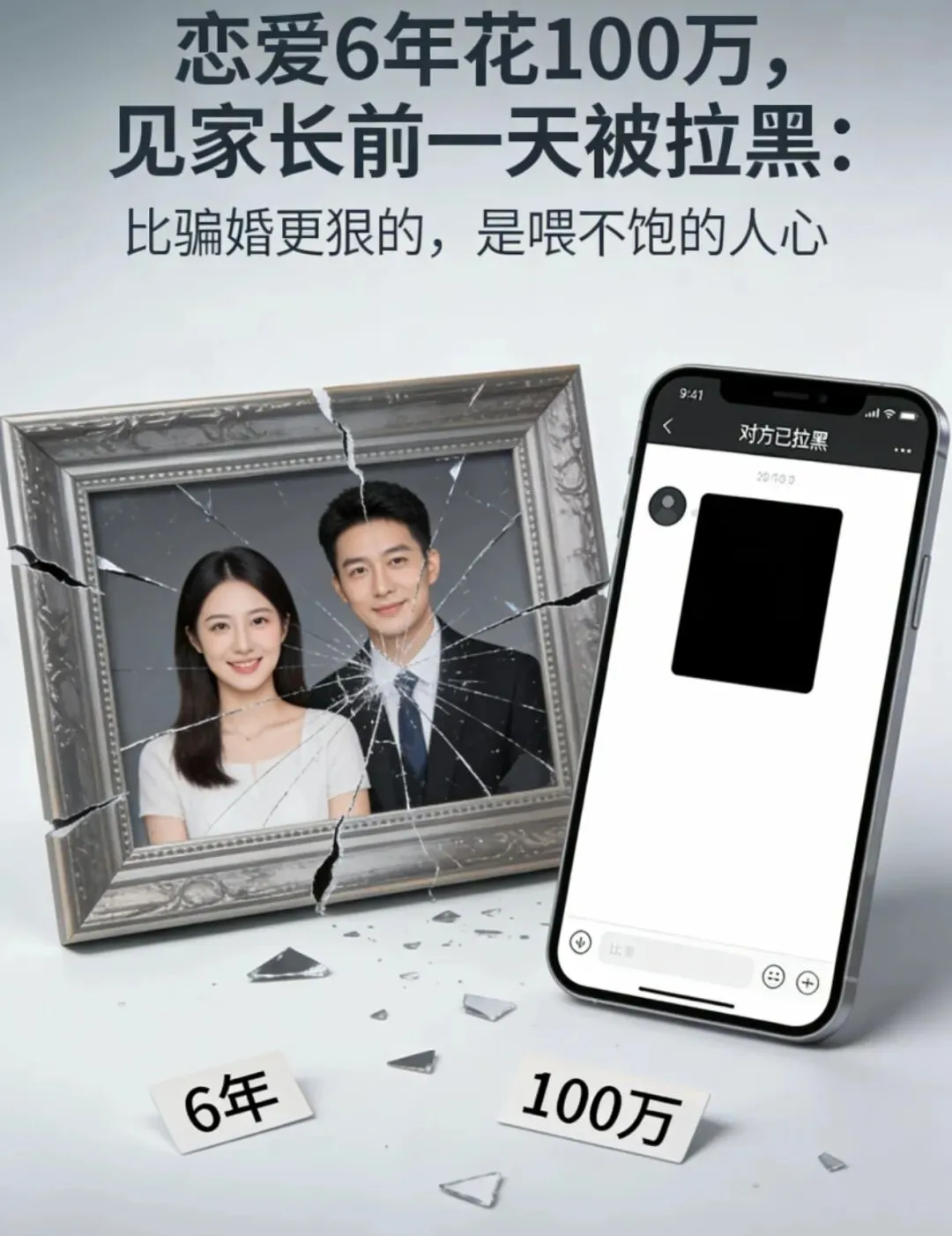 他和女友相恋6年,前前后后为对方花了100多万,连父母20万的养老钱都填了进去,好不容易约定好大年初五双方家长见面,敲定婚期。可就在见面前一天,他只收到一句轻飘飘的“我父母不同意,我们分手吧”,随之而来的,是红色的感叹号——女友把他彻底拉黑了 。