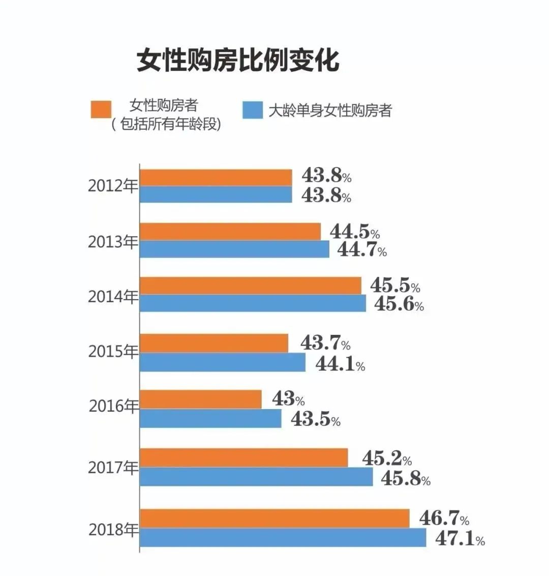 数据显示,虽然整体而言男性依然是购房主力人群,但女性购房者比例正在逐年增加,2018年甚至达到近七年以来的最高点——46.7%。