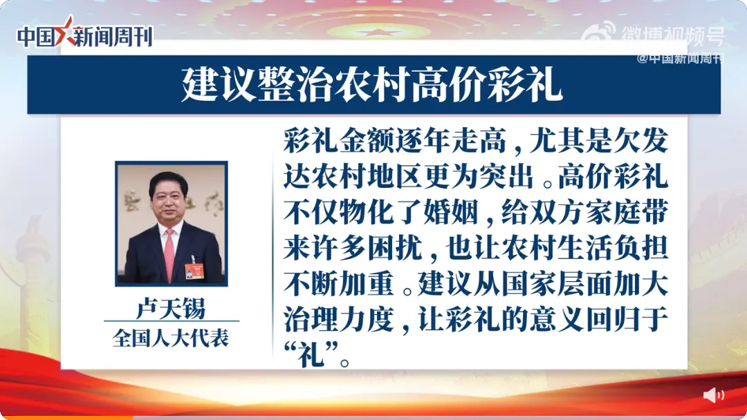 他建议,加大高价彩礼治理力度,严厉打击“买卖婚姻”行为。同时,加强对党员干部婚丧事宜报备、执行情况的纪律约束,发挥公职人员、“两代表一委员”、乡贤名人等“关键少数”在高价彩礼治理工作中的示范带头作用。