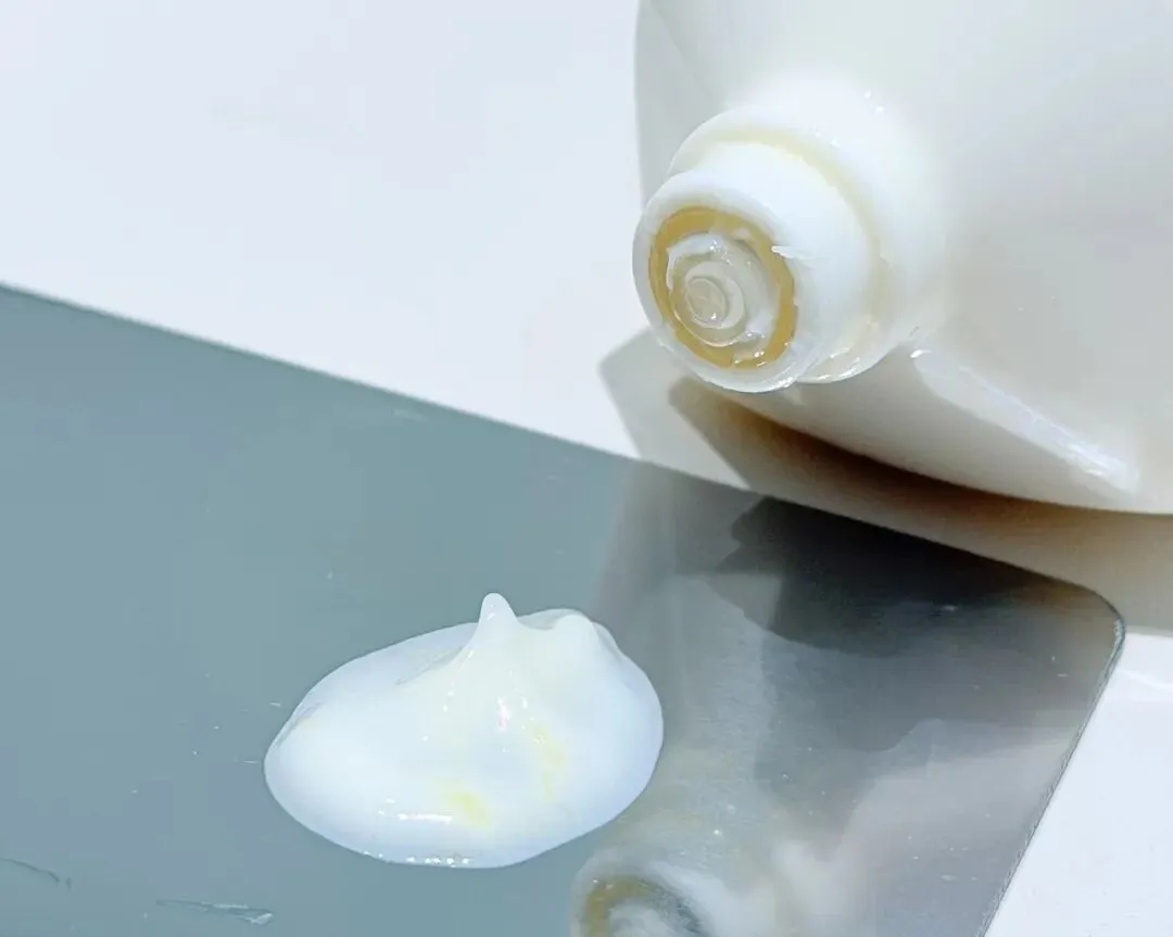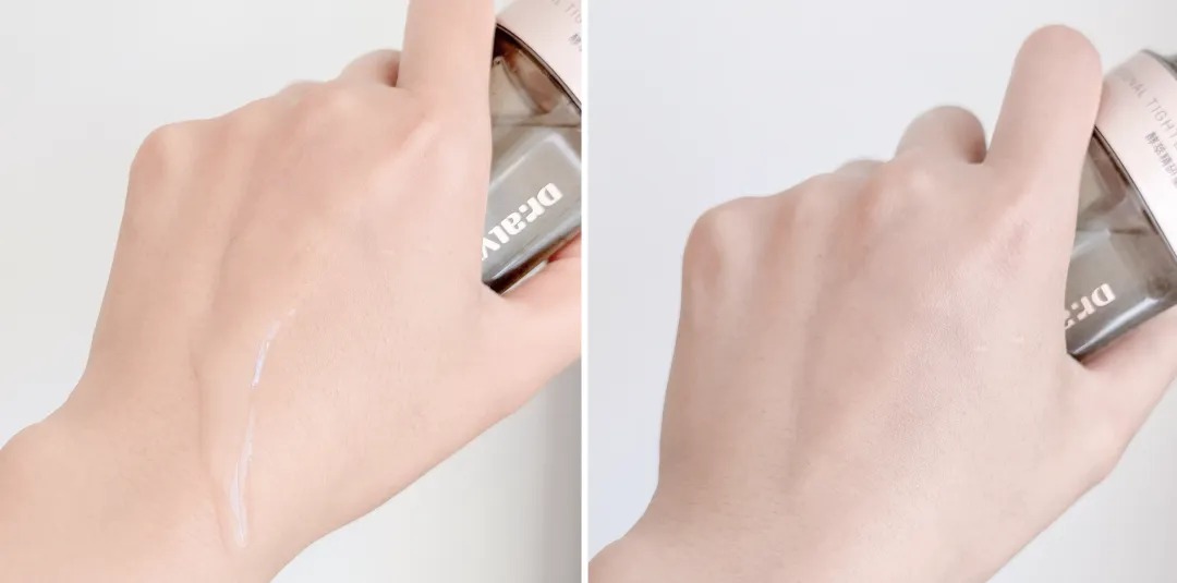 使用前有仪式感,解锁按钮按压,科技感拉满。质地像酸奶,里面肉眼可见的微囊,手指一抹就化开。上脸润而不油,还会形成薄膜,把精华锁住。