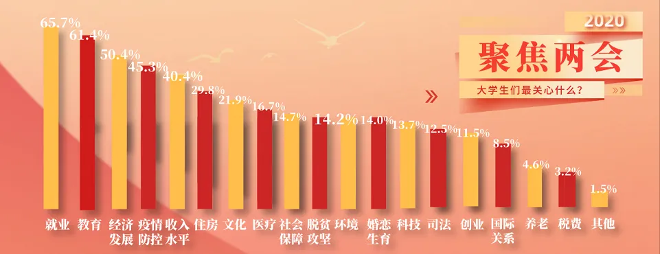受新冠肺炎疫情的影响,今年大学生对疫情防控、公共卫生、医疗等相关议题的关注度较高,排在各个议题中的第四位。