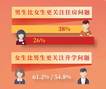 在大学生群体中,关注住房议题的人群比例占到29.8%,其中男生(38.0%)关注住房的程度要高于女生(26.0%)。