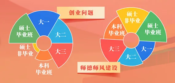 本科生对创业一体的关注程度随年级增高下降,大一到大四的关注比例分别为13.3%、11.2%、11.2%、5.3%。到了研究生阶段,非毕业班学生对创业的关注比例为1.8%,毕业年级则对创业议题格外关注(14.3%)。
