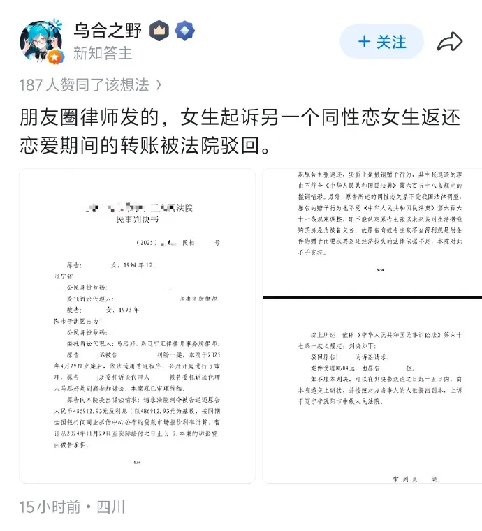 >女生起诉同性恋女友恋爱期间转账,结果被驳回!