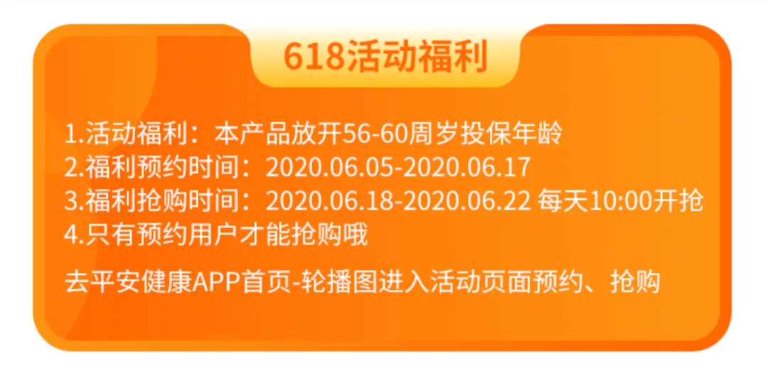 而为了能为更多人带来优惠,平安i康保·百万医疗(慢病版)不光针对18-55岁的人群,在这个618活动期间,还开放56-60岁人群投保。