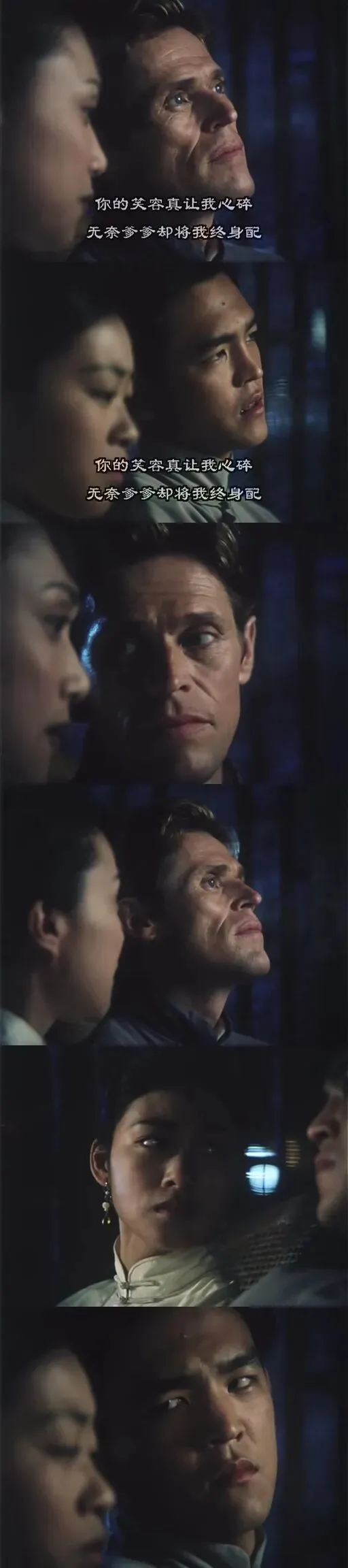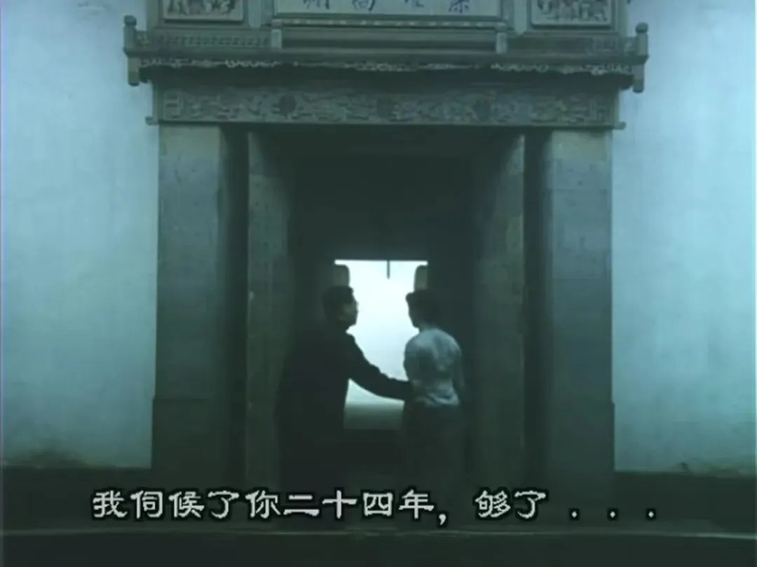 儿子给小妈、大姨太给传教士讲解着台上咿咿呀呀的唱词是什么意思,哀婉缠绵的梁祝戏曲无意或有意的成为了他们传递心声的工具,不敢对视的双眼是两对有情人于情于礼的克制、偶尔慌乱的一瞥是情爱撞心难以自抑的失控。