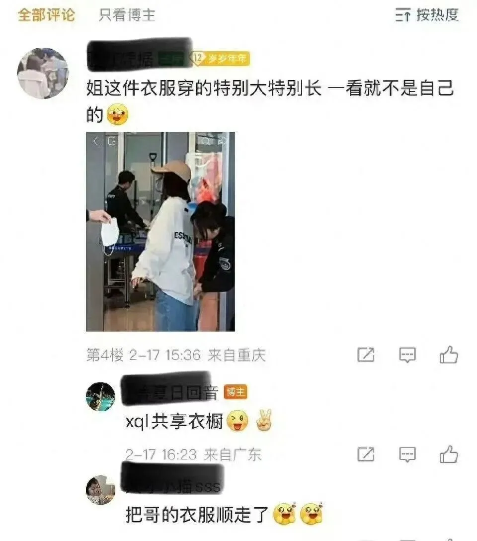面对网友追问,发布路透的博主只回了一句"xql(勋秦岚)共享衣橱",配上眨眼表情,暧昧感拉满。