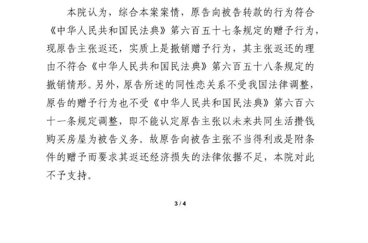 但有意思的是,法院并没有给予原告支持反而驳回了起诉,给出的理由目前来看有两个方面,一方面原告给被告花钱属于“赠与行为”,另一方面涉事双方都是女性同性,不受法律调整。