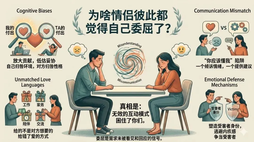 这是一种在亲密关系中非常普遍、但也极具消耗性的现象。当情侣双方都觉得自己“受尽委屈”时,通常并不是因为其中一方在刻意伤害另一方,而是因为心理认知、沟通模式和情感需求出现了错位。