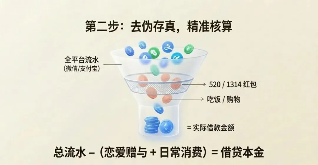 2.逐一剔除非借款款项:直接排除520、1314、999等具有特殊含义的数字转账(此类通常认定为恋爱赠与);剔除能证明是日常消费的支出,如与吃饭、逛街、旅游相关的转账,若有消费凭证可配套留存;