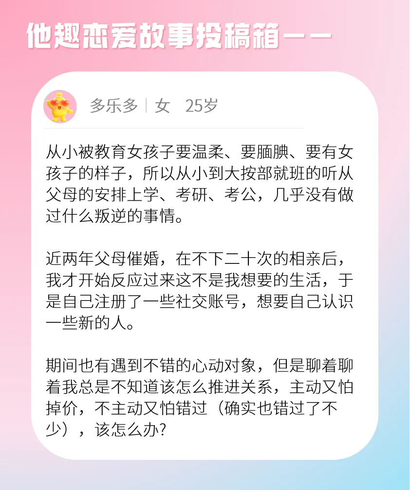 他趣恋爱故事投稿箱总能收到许多趣友的情感困惑,其中@多乐多 提出的问题,道出了不少女生的心声:“遇到喜欢的男生是该主动还是矜持?”这个看似简单的疑问,背后藏着很多人对情感表达的纠结,而他趣也希望通过这份分享,帮大家理清思路,不再在犹豫中错失良缘。