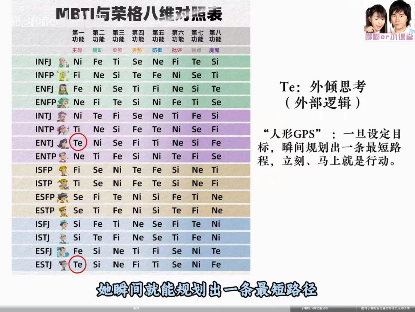 我之前听过《天生不同》,里面对MBTI有比较详细的介绍,那之后我也可以区分各个字母对标的意思,有时候也是比较明显的会看出来的。不过我第一次在这个视频里看到将MBTI和荣格八维分析结合在一起。我看到那张表的时候,我真是看天书一样。看呆了,什么第一功能第二功能。听嘟嘟er分析,我是一愣一愣的,知识以这样的方式进入大脑。哈哈哈哈哈,弹幕也会说,一言不合开始上课了哈哈哈。我还不是很理解底层逻辑,但是听下来很有意思。