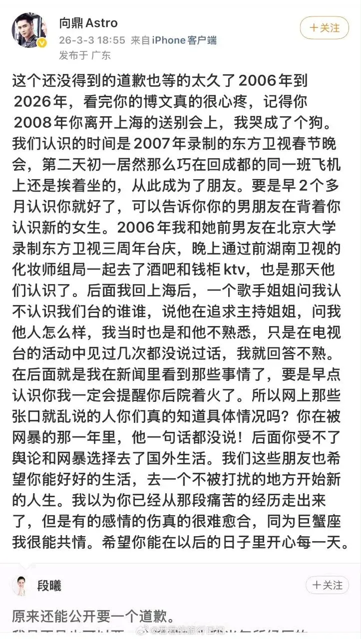 先是薛之谦前女友李雨桐在微博发长文控诉薛之谦重婚、逼堕胎等,后是谢娜霸气护夫,要求薛之谦为张杰话道歉,原因是薛之谦在节目中说的话致使张杰被网暴,却不曾想张杰前女友段曦出面指责张杰恋爱期间出轨,称自己多年遭受“被第三者”网络暴力,生活、工作、感情都受到影响。张杰也是终于进行回应,表示过往的感情自己心存尊重,也祝各自安好。与娜娜在一起时,是单身的状态,现在只专注于自己的家庭与工作,用作品说话,此事不再多言。有人调侃,薛之谦现在得非常感激谢娜了吧,一下子把注意力转移了。还有人调侃说,薛之谦只不过是往人群里丢了把刀,扎到的人的老婆喊得最大声。段曦与张杰,你更相信谁?也许明天事情又迎来反转,还是先让子弹再飞一会儿吧。