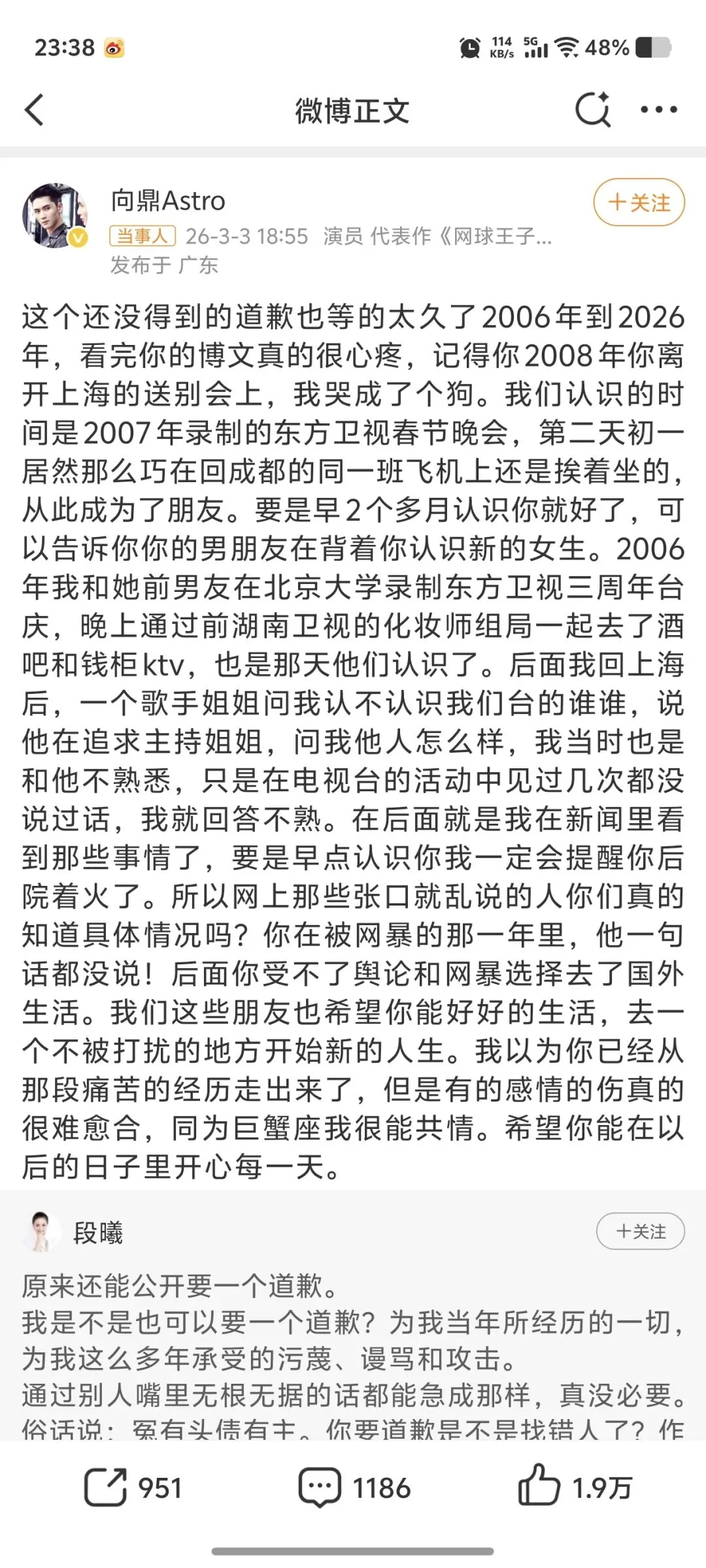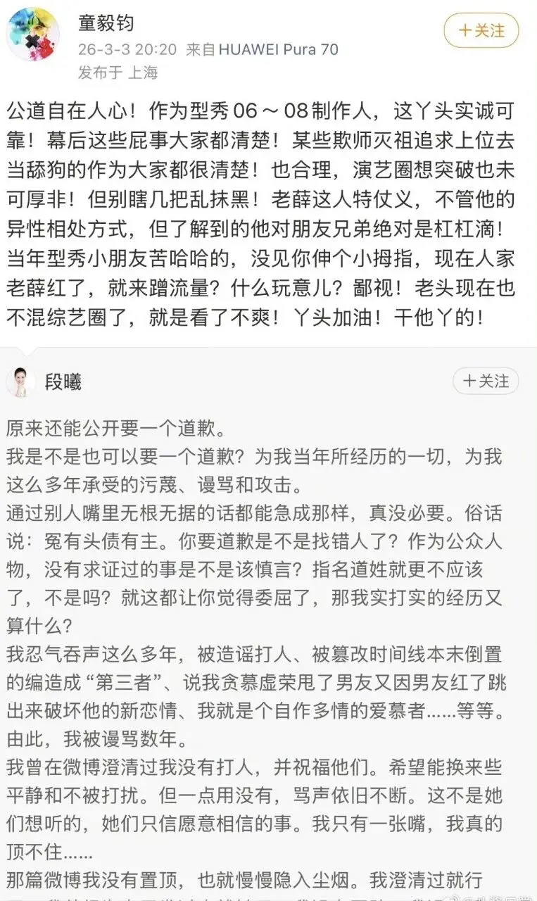 2026年3月3日:段曦发长文澄清:从未掌掴谢娜,也未插足他人感情。多年被造谣致网暴、丢代言、生活受扰。公开要求张杰道歉:“我该向谁要一个道歉?”