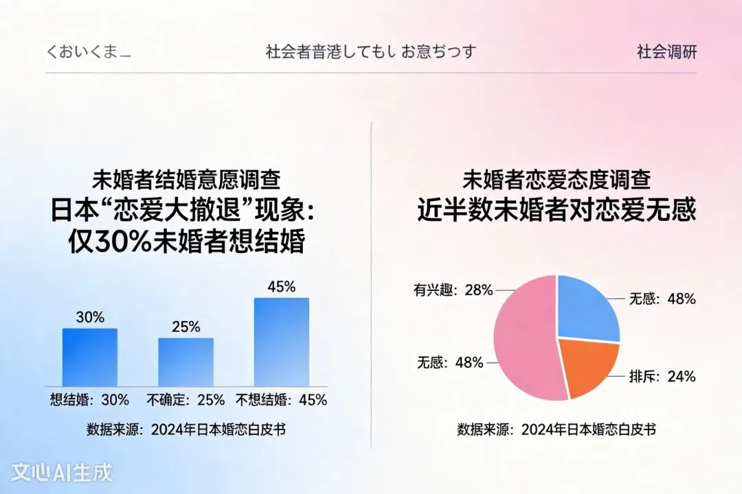 当爱情变成一种选择,而非必需品,日本年轻人的婚恋观正在悄然重构。近半数未婚者“对恋爱无感”,年轻人正在逃离爱情。