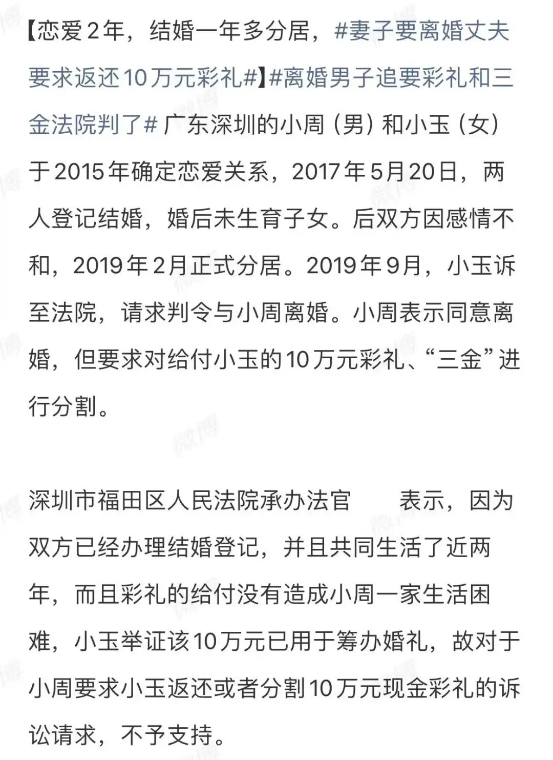 >恋爱两年,结婚一年多分居,妻子要离婚丈夫要求返还10万元彩礼.