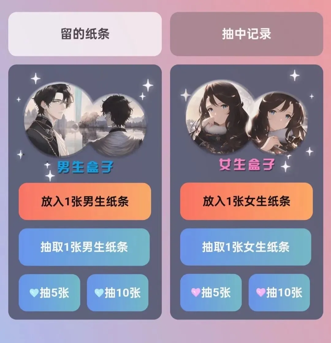 抽取纸条或者放入纸条,显示那个她/他,寻找真心的另一半吧~