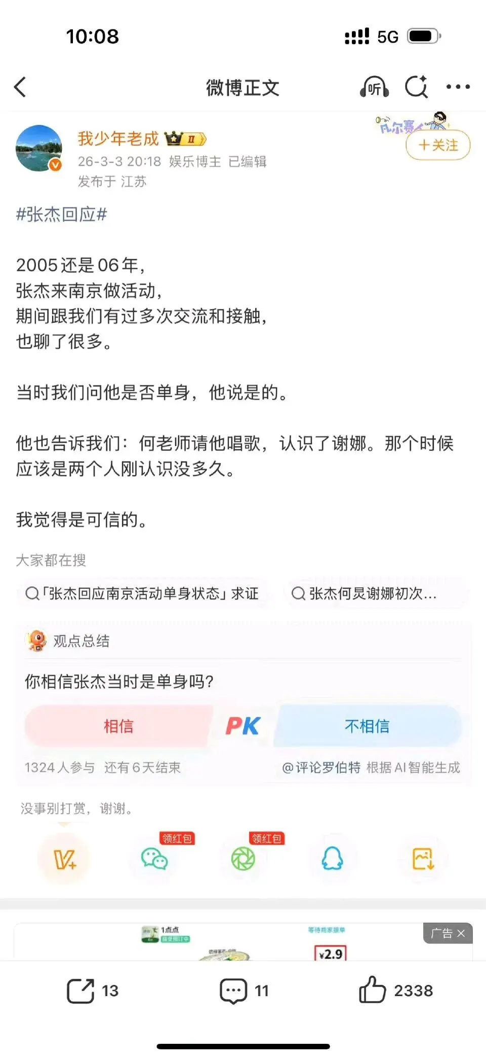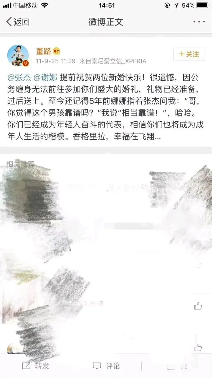 演员向鼎发文称,2006年曾目击张杰在北京追求“主持姐姐”(疑指谢娜)。