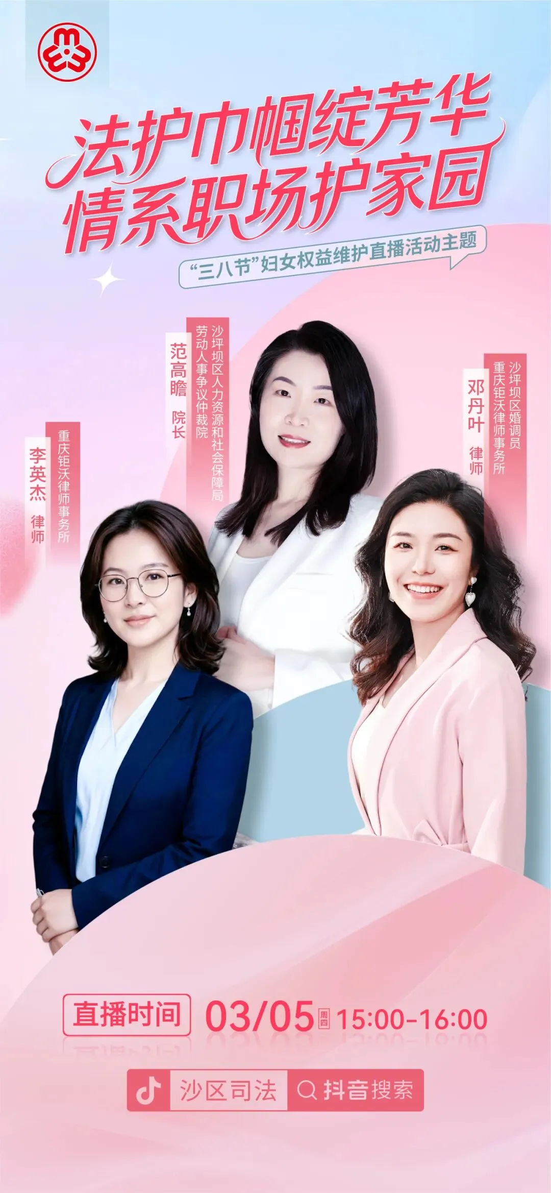 3月5日下午3点,沙坪坝区司法局官方抖音号“沙区司法”将推出“三八”国际妇女节“法护巾帼绽芳华 情系职场护家园”主题直播活动,为您逐一拆解。