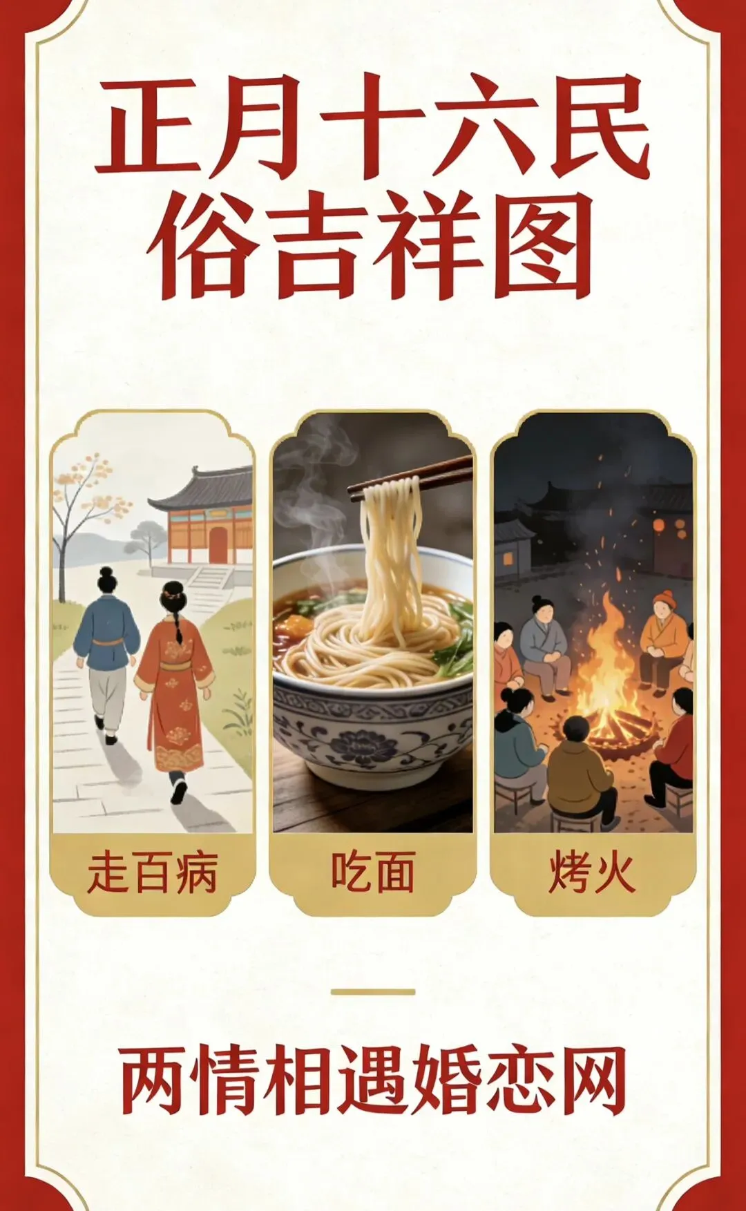 正月十六,是春节真正落幕的日子,民间以“送年、除晦、纳福”为核心,形成一系列代代相传的习俗,既承续传统,又饱含对新年的期许。最核心的是走百病(游百病),民谚“正月十六走百病,游了百病不生病”,人们盛装出门,登山、逛庙会、走桥、踏青,尤其要过三座桥,称“走三桥”,寓意跨过坎坷、甩掉病气与晦气,让身心焕然一新。北方多“烤百灵火”,点燃柏枝篝火,围火念“烤烤手,手不疼;烤烤脚,脚不冷”,借旺火驱寒除邪,祈愿全年安康。