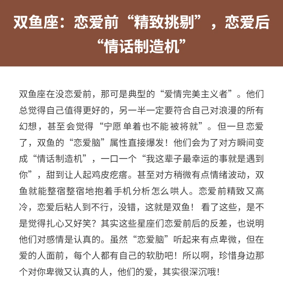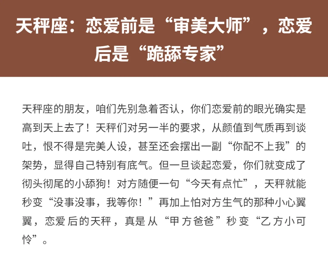 恋爱这件事吧,有些人真的是“前后判若两人”。恋爱前各种高冷挑剔,嘴上说着“不可能将就”“宁缺毋滥”,像极了爱情里的严格甲方。可一旦真开始谈恋爱了,秒变卑微乙方,瞬间把自己摆在尘埃里,甚至还觉得自己是幸福的小花花。这种“恋爱脑”属性,真的是说来就来,挡都挡不住!今天咱们就来聊一聊,那些恋爱前挑三拣四,恋爱后卑微到骨子里的星座,看看有没有戳中你或者你身边的TA!