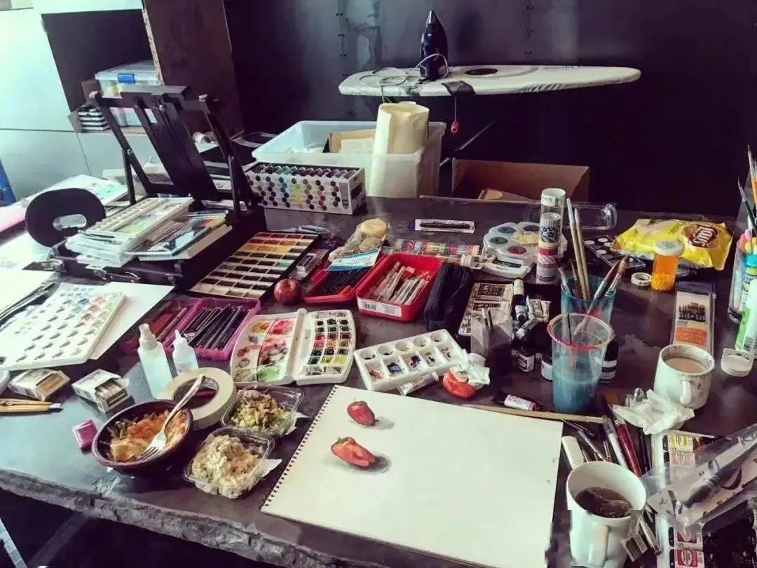 一张长方形的大工作台,摆满了写字、画画用的工具, 创作的时候,徐静蕾面对暗黑的墙面,专注投入。