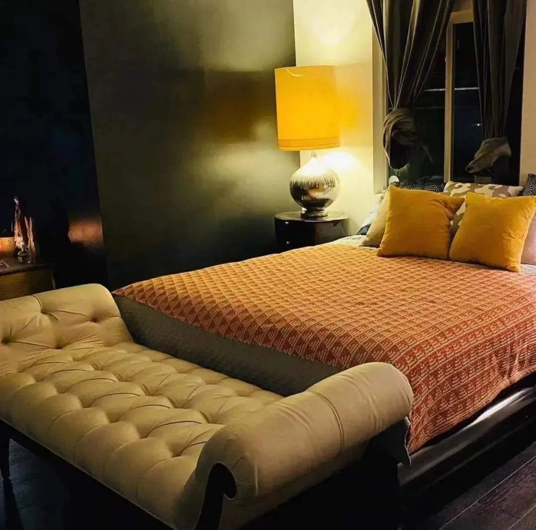 卧室墙面也是刷成黑色,红色花纹床单搭配橘黄色的抱枕,配上暖黄色台灯,卧室透着一种高级的复古感,整个空间变得温馨起来。