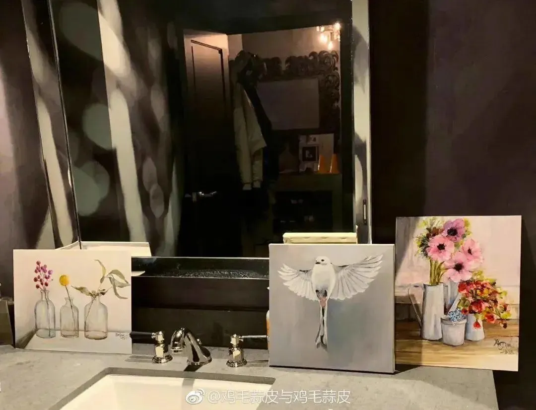 卫生间的装修依旧延续了装修的风格,墙面照样是黑色的,卫生间的洗漱台上,摆放了不少徐静蕾自己的画作。