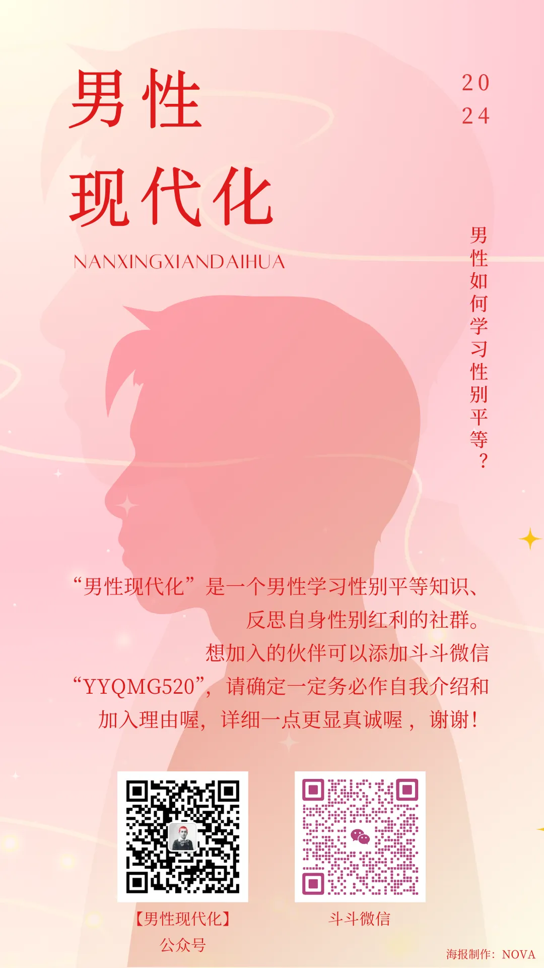 #男性现代化 是一个男性学习性别平等知识、反思自身性别红利的社群,想加社群的伙伴可以添加李斗斗微信“yyqmg520”,每年需交36元年费支持社群运营(公益从业者、经济困难者可申请优惠)。另外,咨询/约稿/合作/防失联/扩列/转载等,也欢迎加李斗斗,麻烦注明来意和自我介绍!