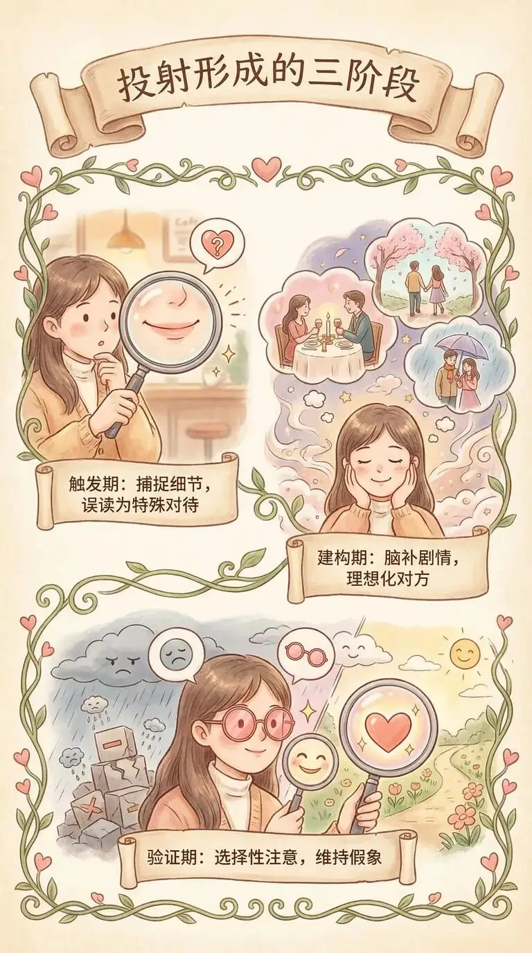 ● 验证期:选择性接收符合投射的信息,忽略所有矛盾证据。大脑不断自我说服,维持“被喜欢”的假象