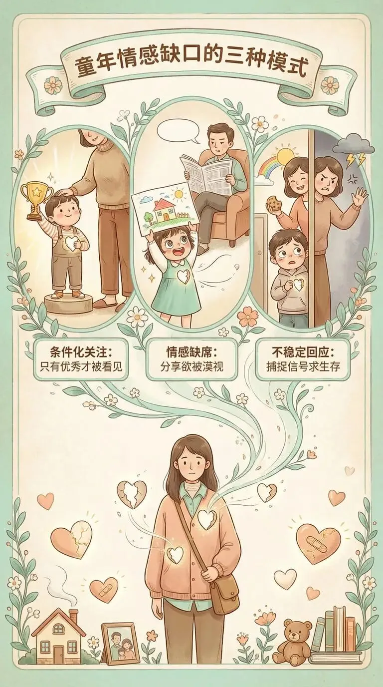 ● ③不稳定回应:养育者情绪反复无常,让你形成“必须时刻捕捉微弱信号才能确保安全”的生存策略