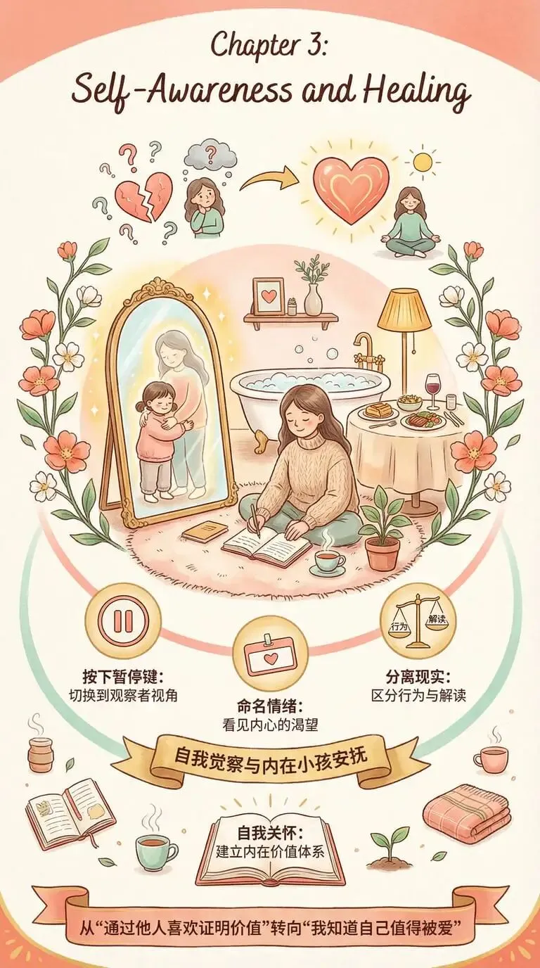 ● ②命名情绪:在心里告诉自己“我内心那个渴望被看见的小孩又出现了,这很正常,不代表他真的喜欢我”