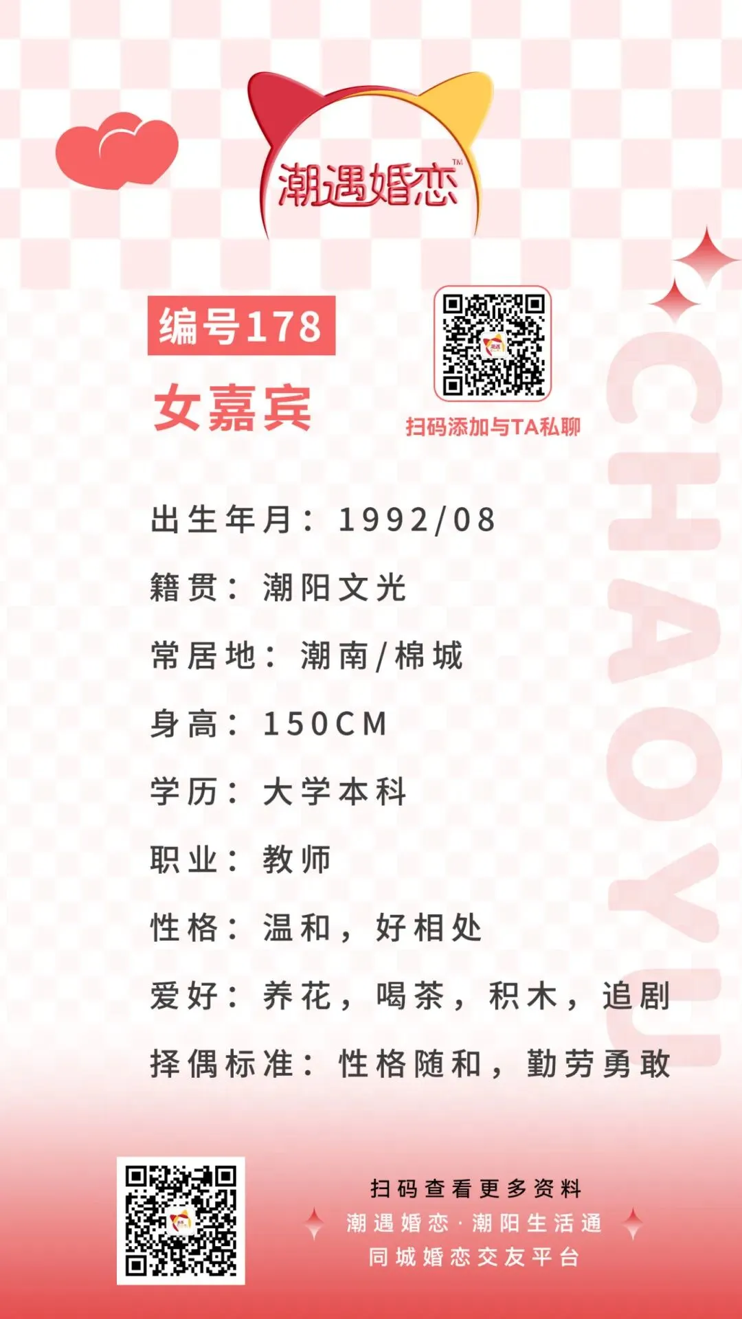 【潮遇婚恋】嘉宾:编号178号女嘉宾 · 常居潮南/潮阳,职业教师~