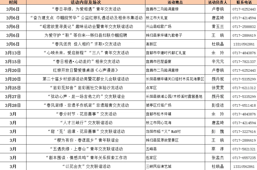 春风拂面,暖意融融,正是邂逅美好、奔赴良缘的好时节。为深入落实“知音湖北˙才聚荆楚”婚恋服务工作要求,切实服务宜昌青年婚恋交友需求,搭建真诚、优质的交流平台,宜昌市妇联携手各县市区妇联,重磅推出 2026 年 3 月青年人才交友联谊系列活动。缤纷活动轮番上线,多样形式解锁心动邂逅,让青春在相遇中绽放,让幸福在宜昌扎根!
