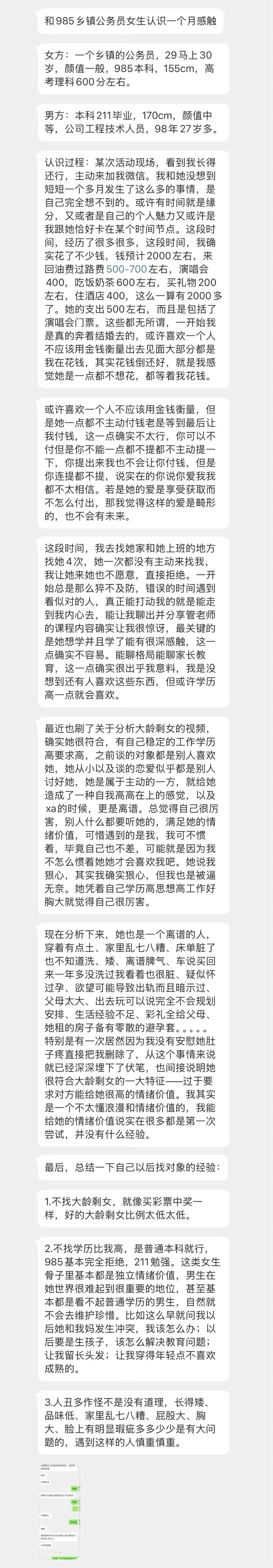 韩依凡: [無聊] 相处一个多月,“确实花了不少钱,钱预计2000左右”。兄弟,你不是奔着结婚去谈的吗?算这么清?满打满算2300也不多啊。你倾慕高学历,一顿诋毁就体现你的211学历了吗?“她学历高思想高工作好胸大”,你要不要听听看自己的措辞,真的思想匮乏啊……