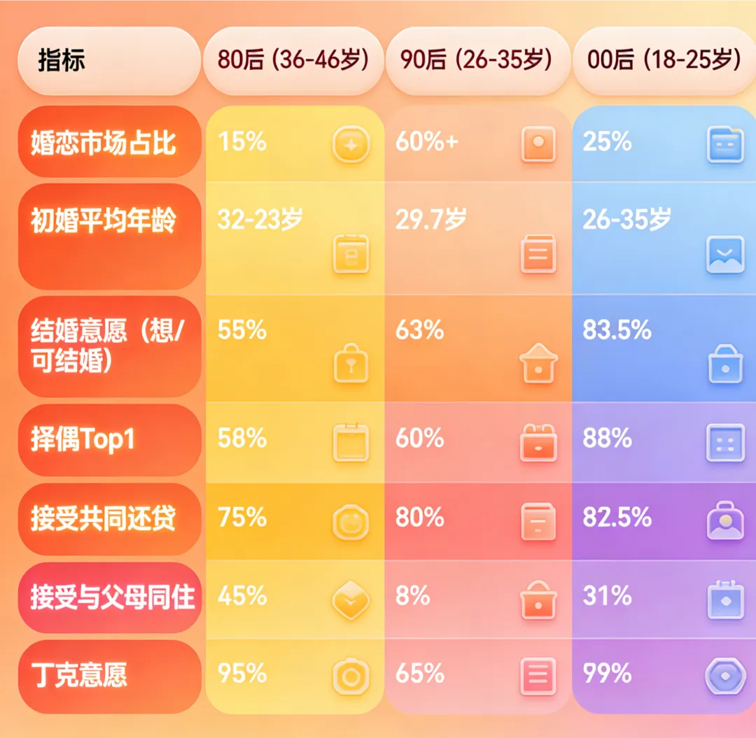 - 80 后已步入中年,未婚的都是事业稳、标准清的狠角色!择偶只看三观合、家里和、没经济隐患,稳定性和带娃比啥都重要;仅 15% 和父母同住,小家庭独立焊死,婚房、养老、育儿规划得明明白白~