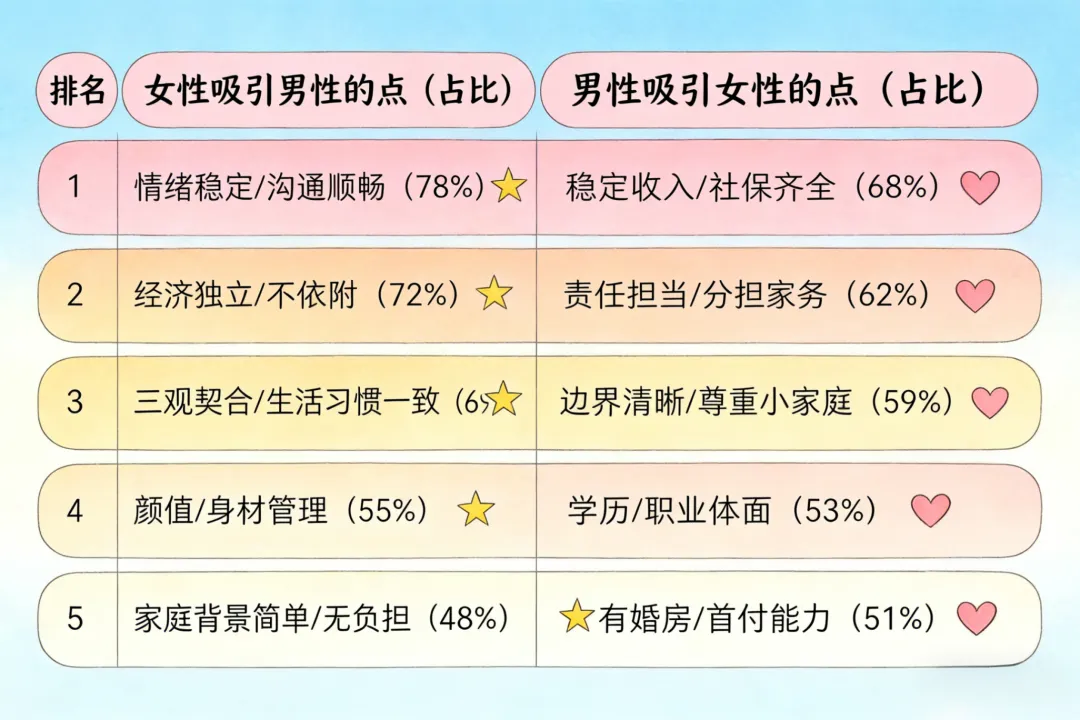 ✅ 女生吸睛点:经济独立不依附、情绪稳定不内耗、务实通透不矫情、三观合拍懂边界✅ 男生加分项:工作稳定无负债、愿意分担家务带娃、边界清晰不妈宝、有上进心有规划04