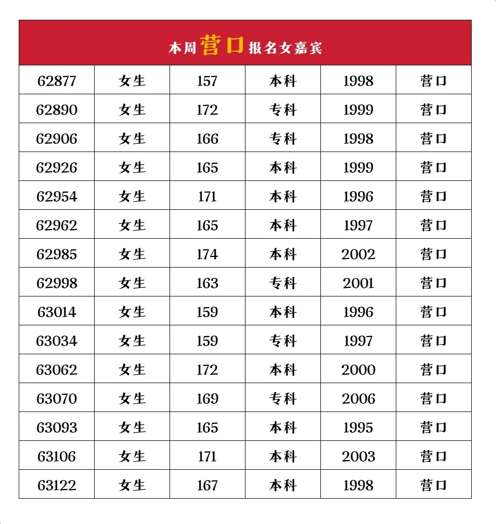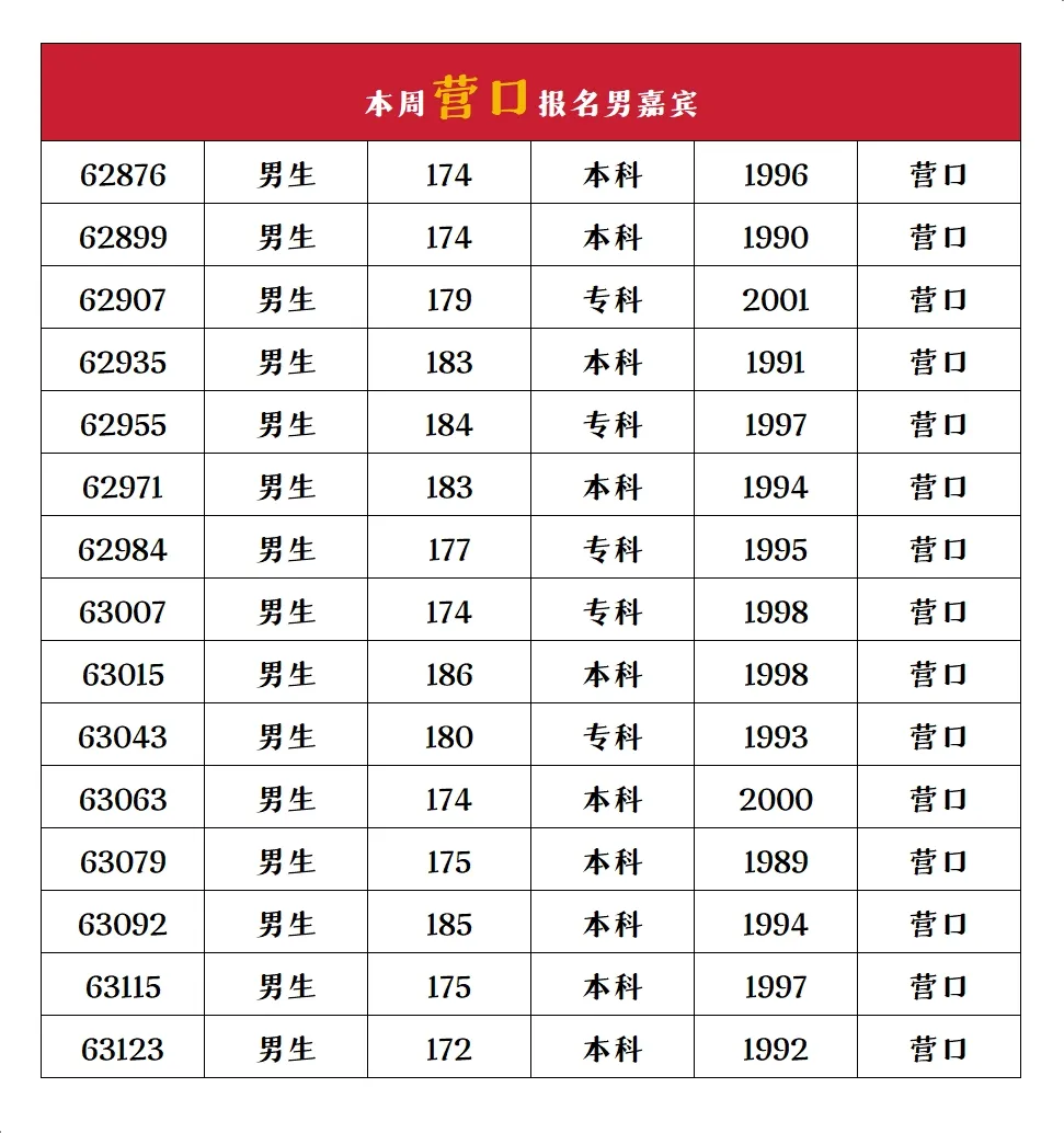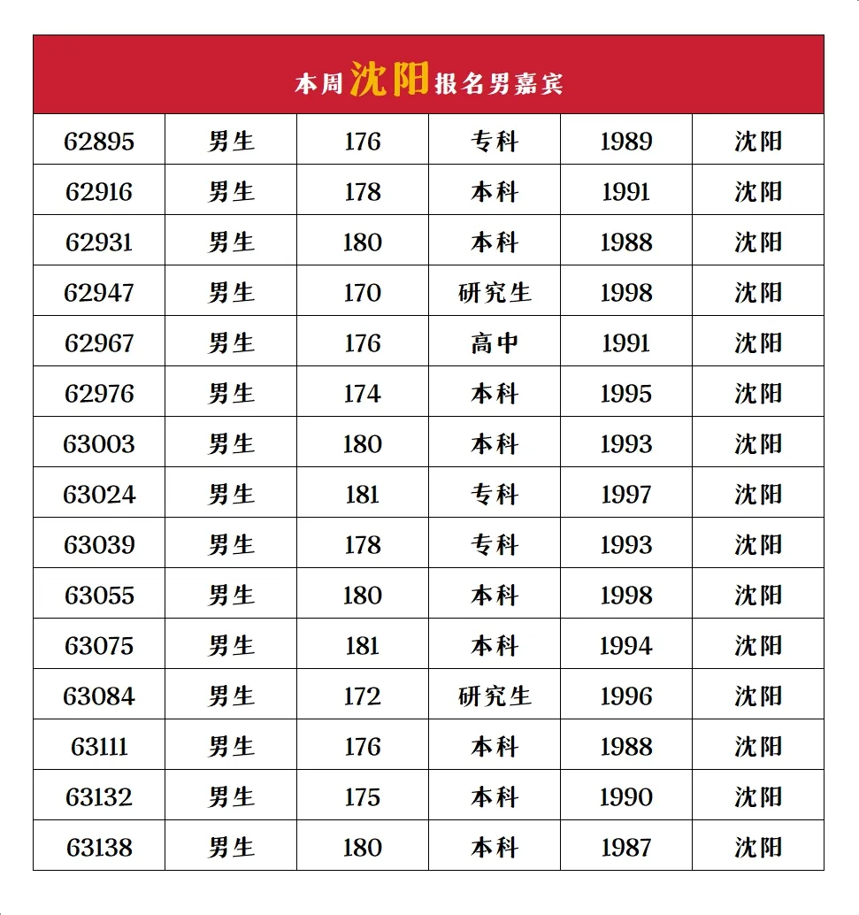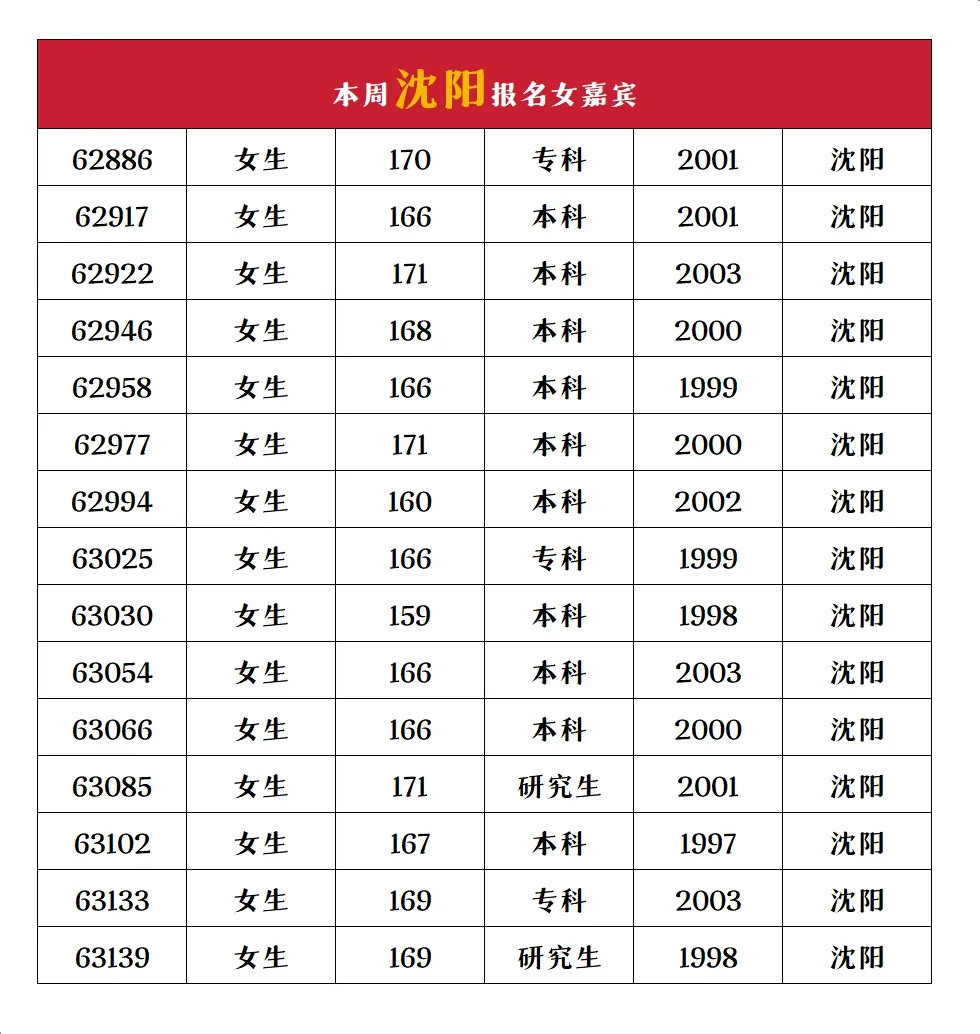 本期恋爱匹配已报名嘉宾,篇幅有限,每个城市仅展示部分嘉宾,目前辽宁开放城市:沈阳、大连、鞍山、盘锦、锦州、营口、朝阳、本溪、抚顺