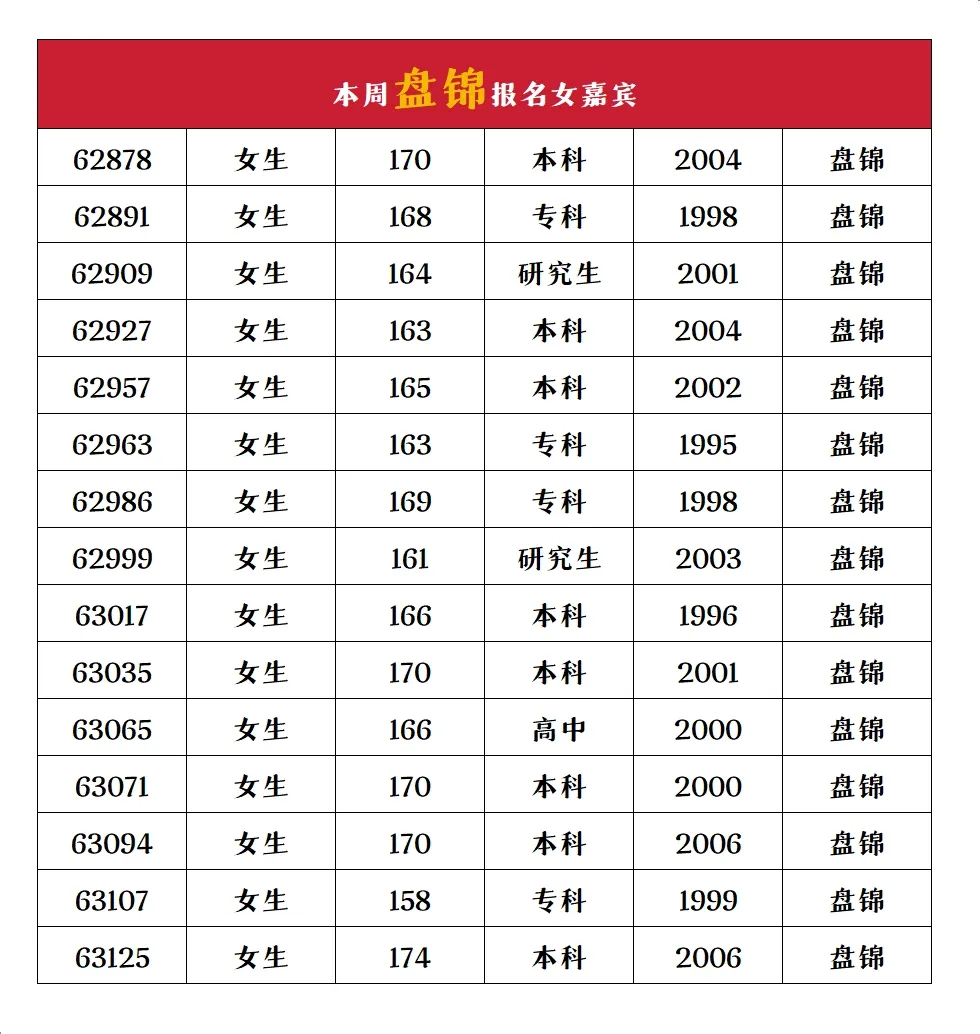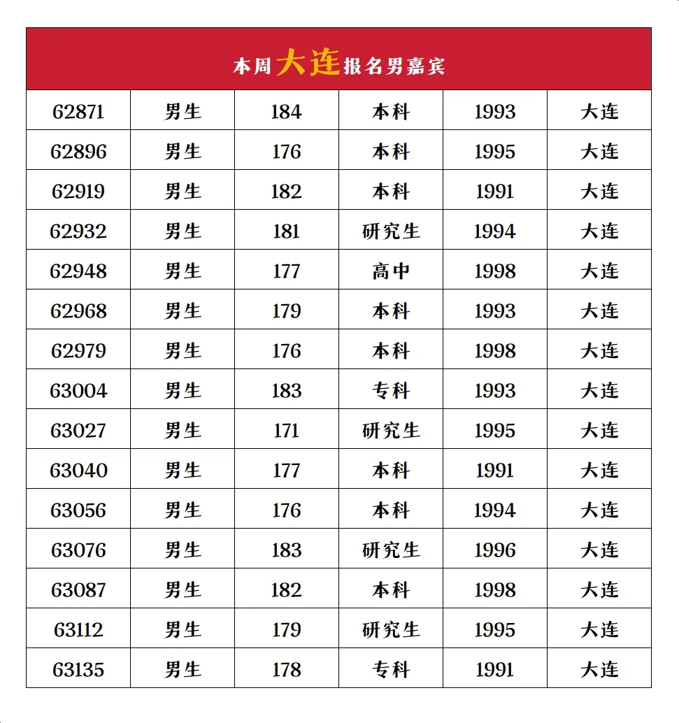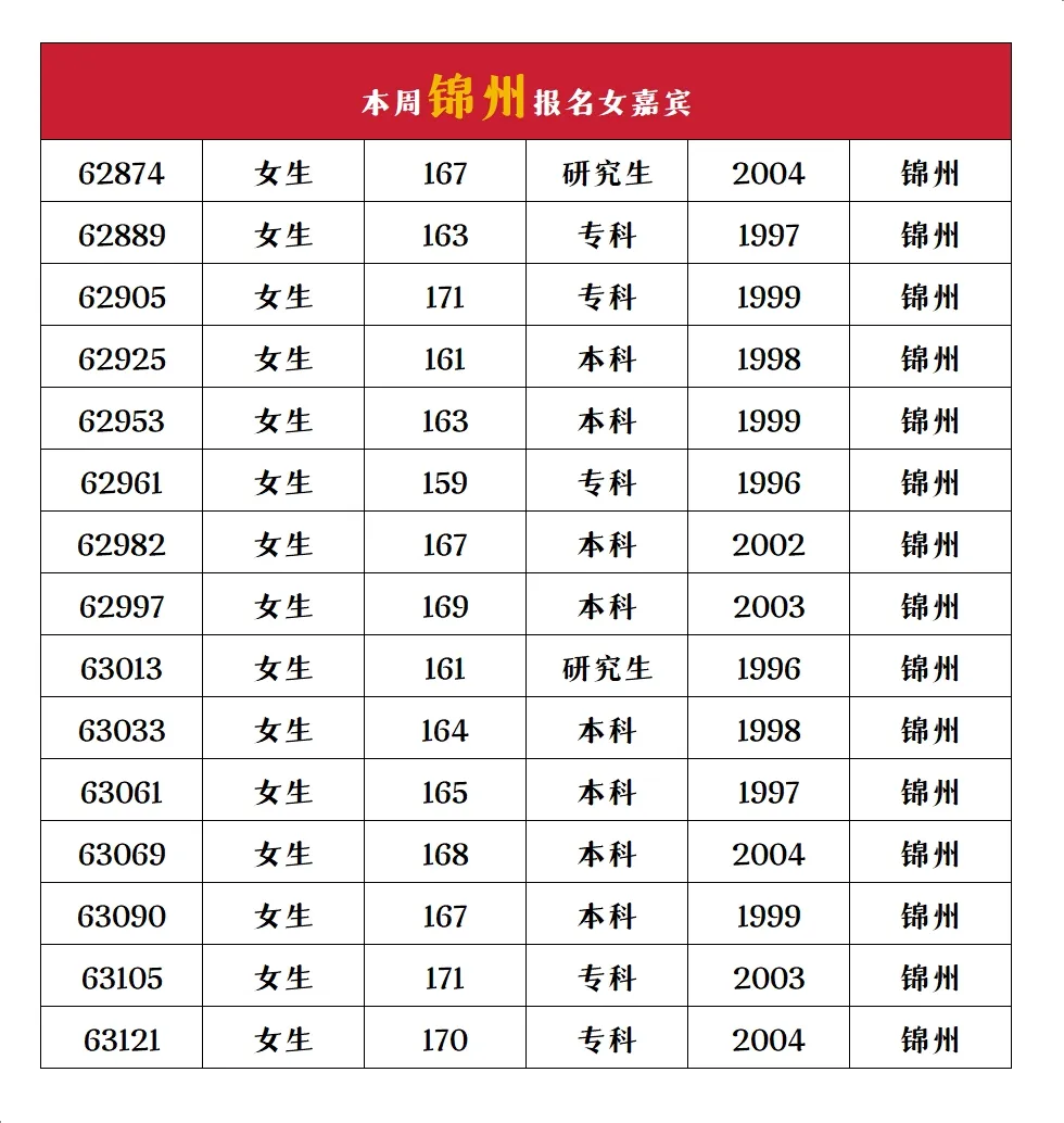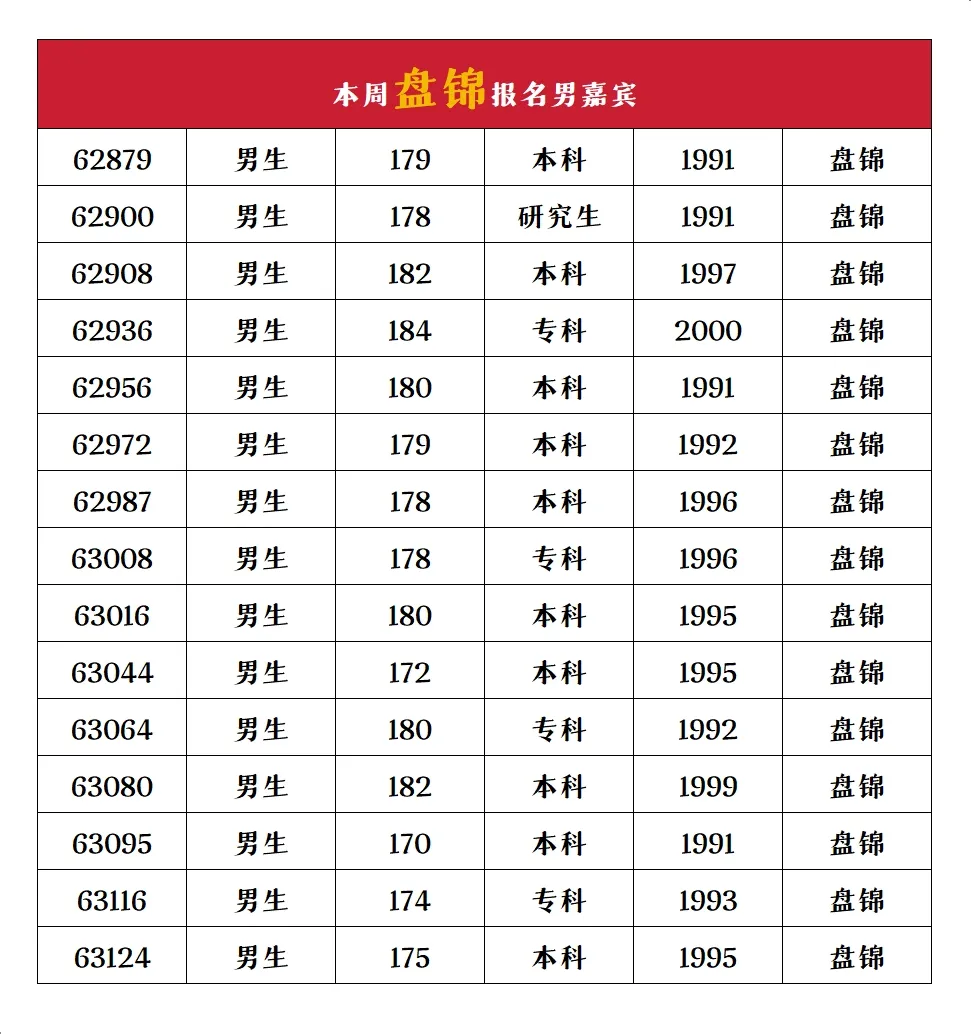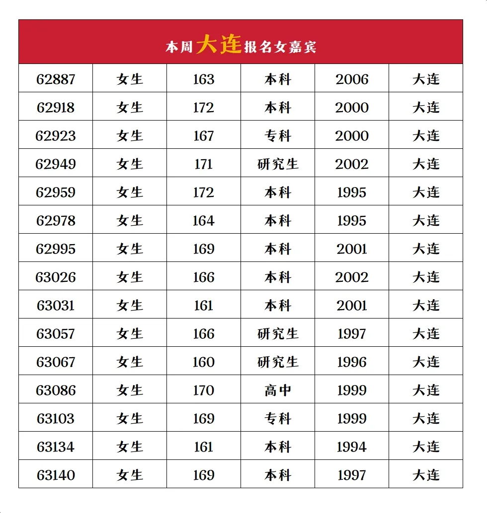 本期恋爱匹配已报名嘉宾,篇幅有限,每个城市仅展示部分嘉宾,目前辽宁开放城市:沈阳、大连、鞍山、盘锦、锦州、营口、朝阳、本溪、抚顺