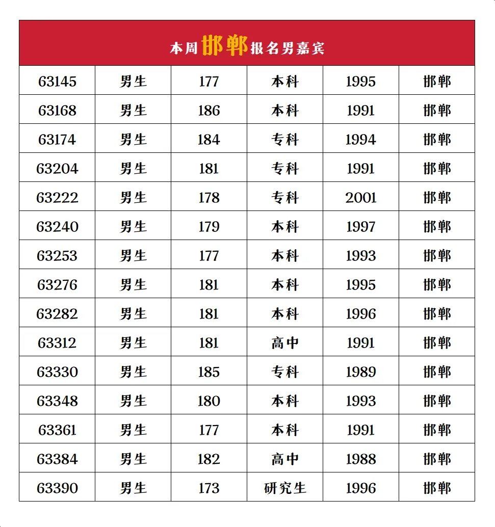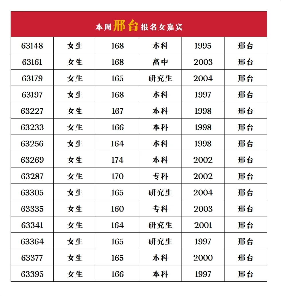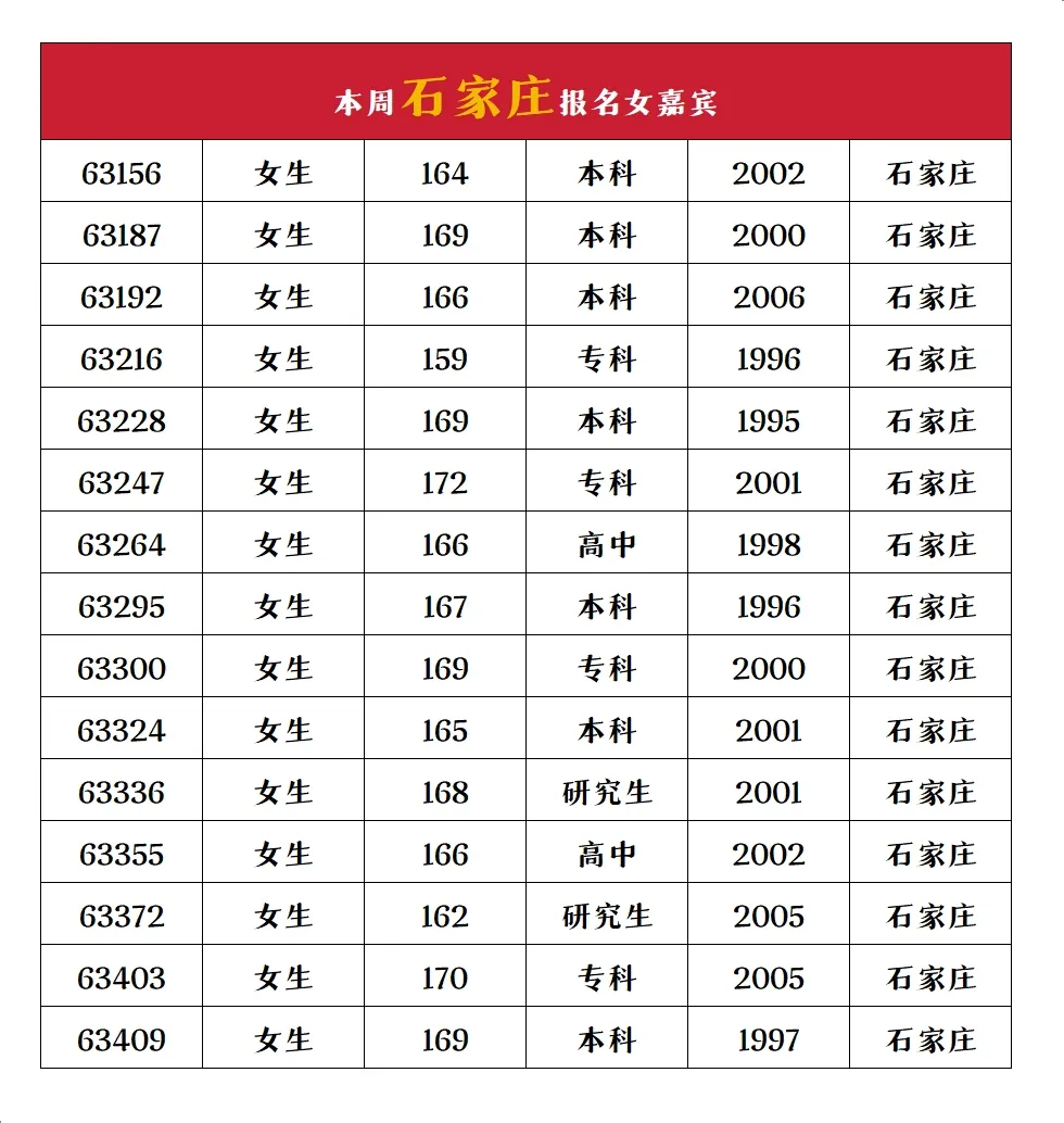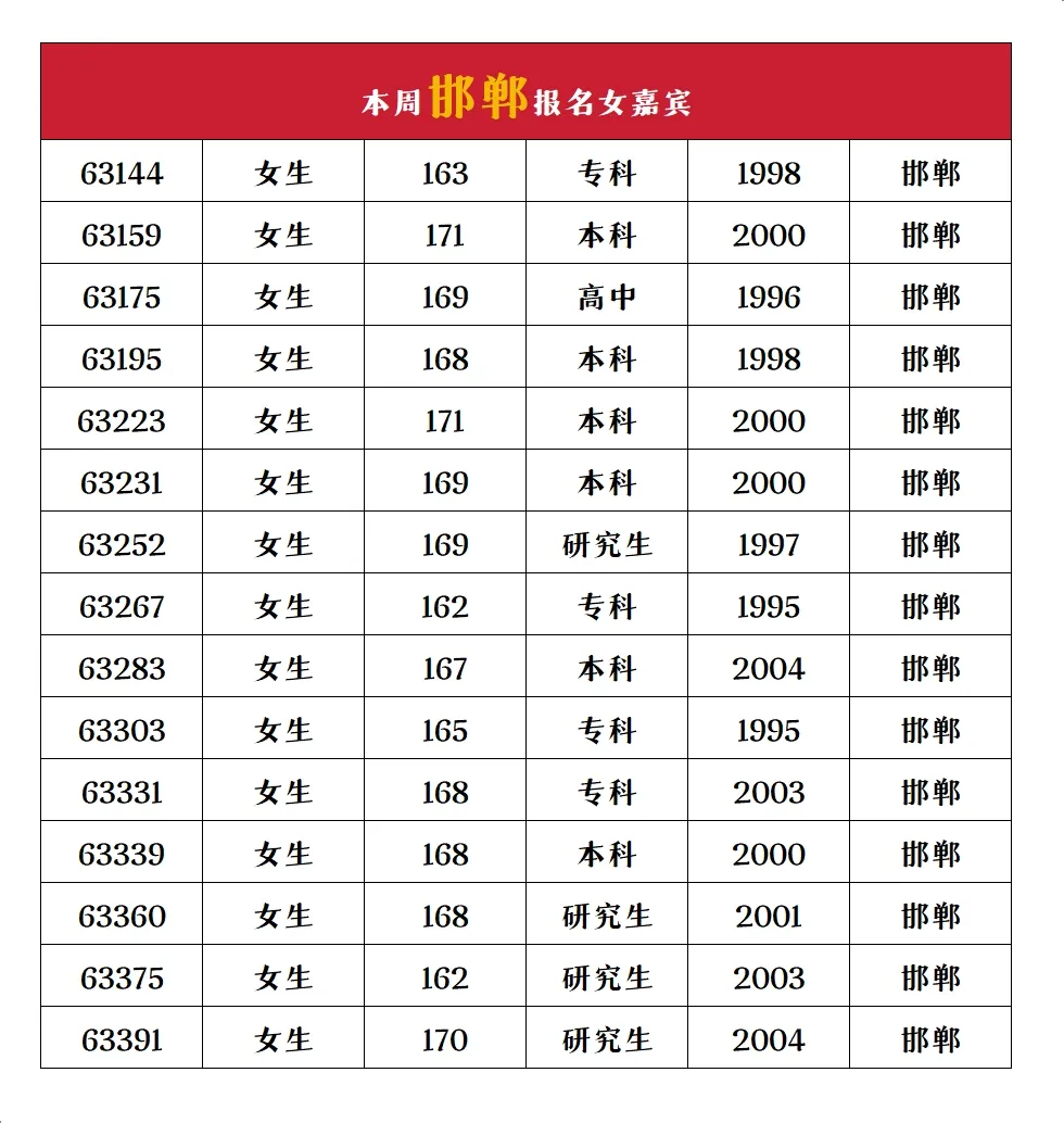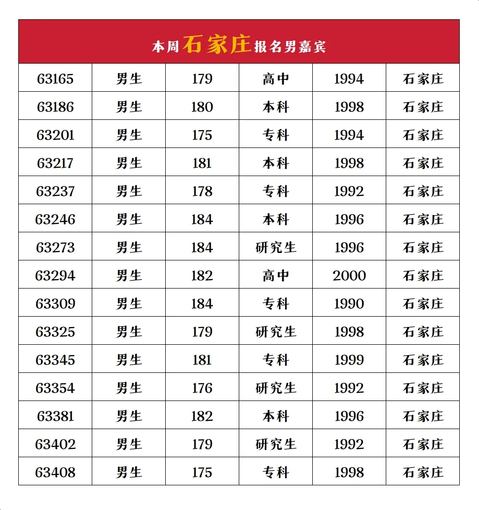 本期恋爱匹配已报名嘉宾,篇幅有限,每个城市仅展示部分嘉宾,目前河北开放城市:石家庄、保定、唐山、邯郸、沧州、邢台、廊坊、衡水、张家口。