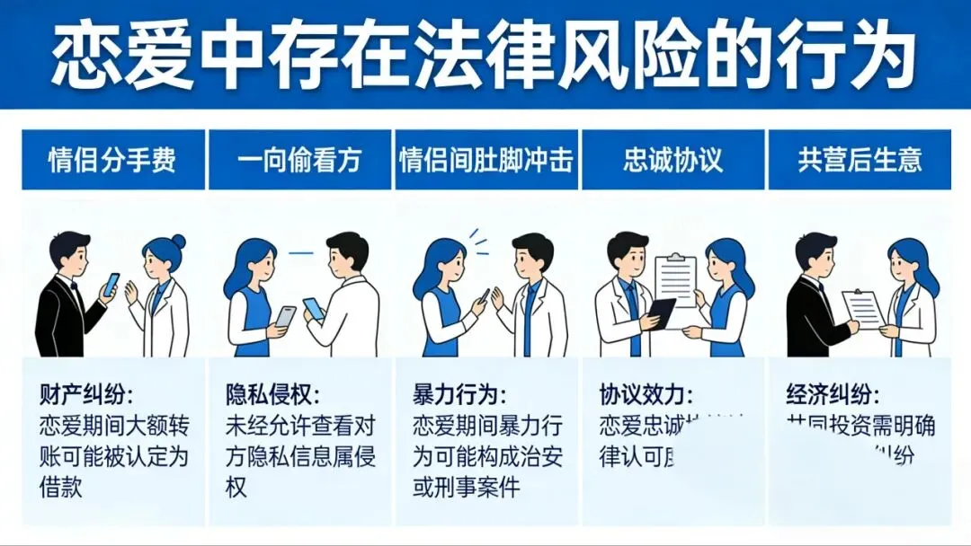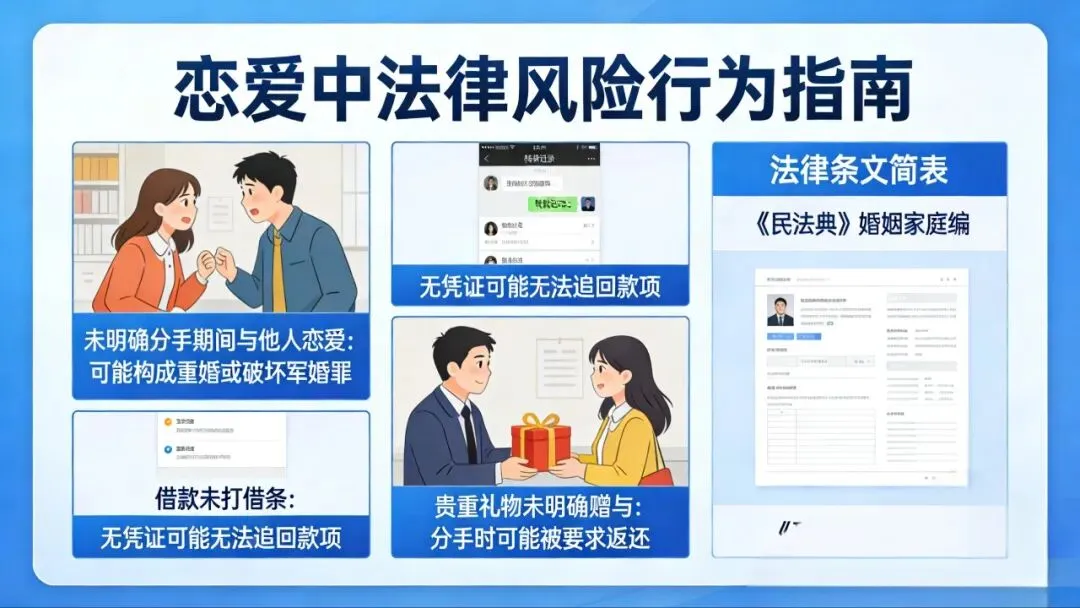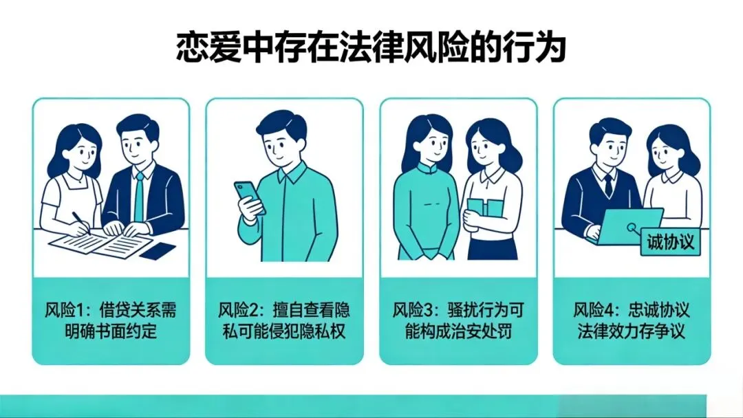 总有人觉得,恋爱是两个人的事,谈钱伤感情,谈法太见外。可现实是,不少甜蜜关系走到尽头时,都栽在了“没边界”“没底线”的行为里。今天就来聊聊,那些藏在恋爱细节里的法律风险——