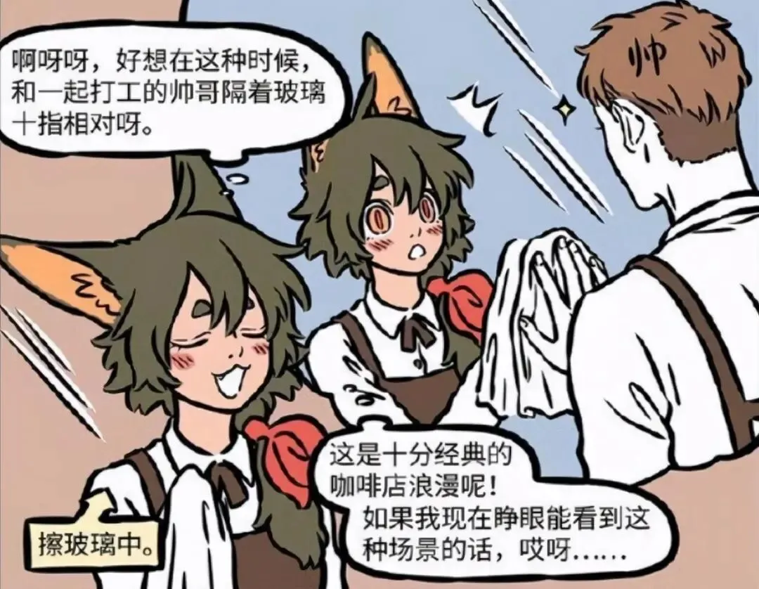 虽然这份工作的内容似乎和陶陶的幻想有些不一样,但是陶陶仍旧没有放弃幻想,在陶陶的幻想中会有一个帅哥同事,两人一起擦着玻璃然后出现隔着玻璃十指紧扣的场景,在偶像剧中这是十分经典的咖啡店浪漫呢。