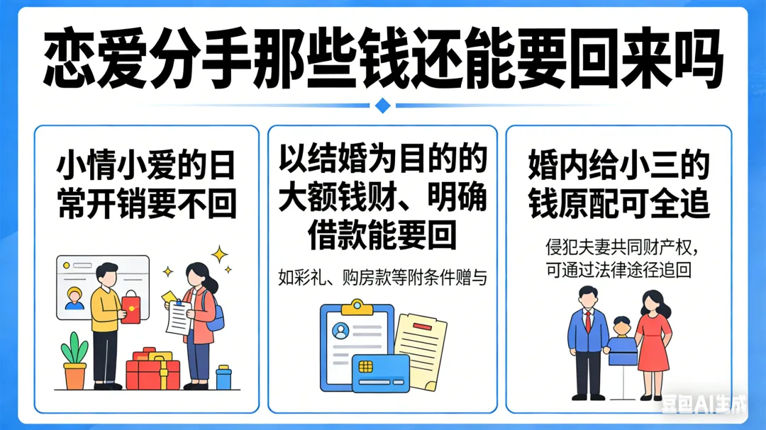 💬 一句话总结:小情小爱的日常开销要不回,以结婚为目的的大额钱财、明确借款能要回,婚内给小三的钱原配可全追。
