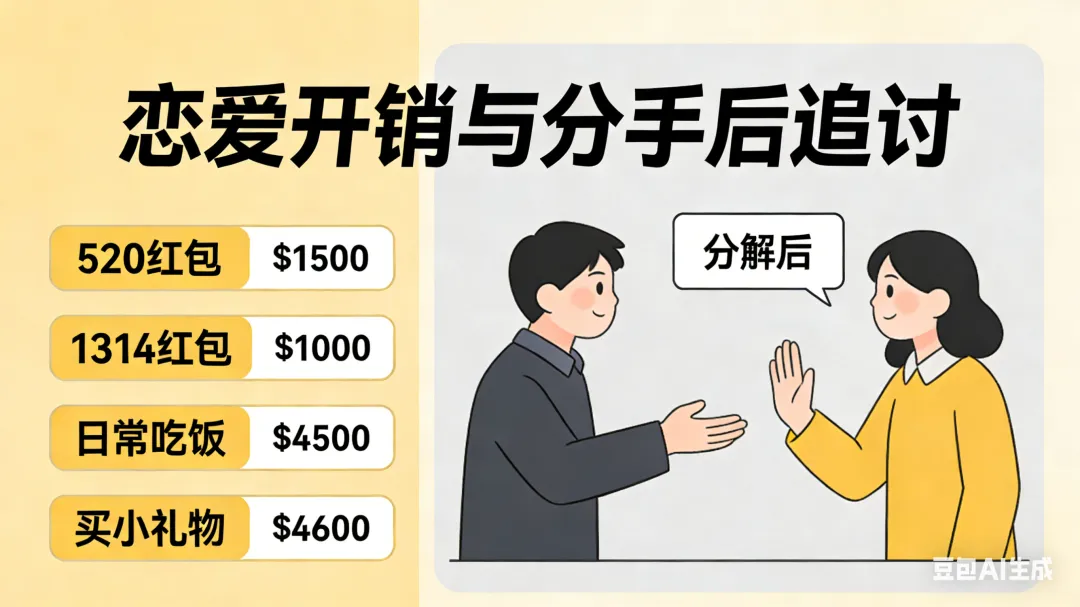 - 恋爱时发的520、1314红包,平时吃饭、买小礼物的钱,分手后要不回来;